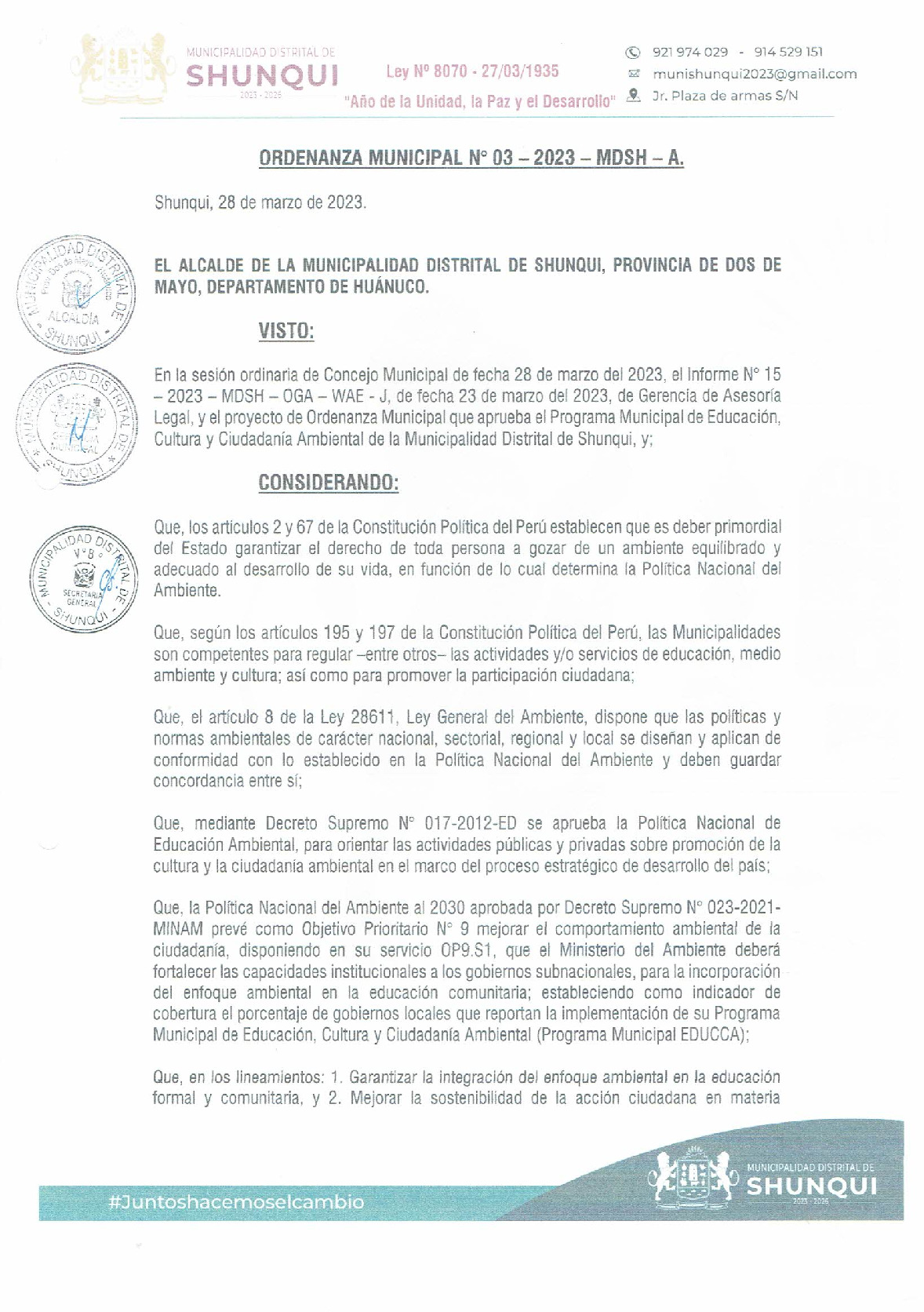 La presente Ordenanza aprueba el Programa Municipal de Educación, Cultura y Ciudadanía Ambiental de la Municipalidad Distrital de Shunqui - Dos de Mayo (Huánuco), con la finalidad de promover la cultura y la educación ambiental para la formación de ciudadanas y ciudadanos ambientalmente responsables e incentivar la participación ciudadana en todos sus niveles.