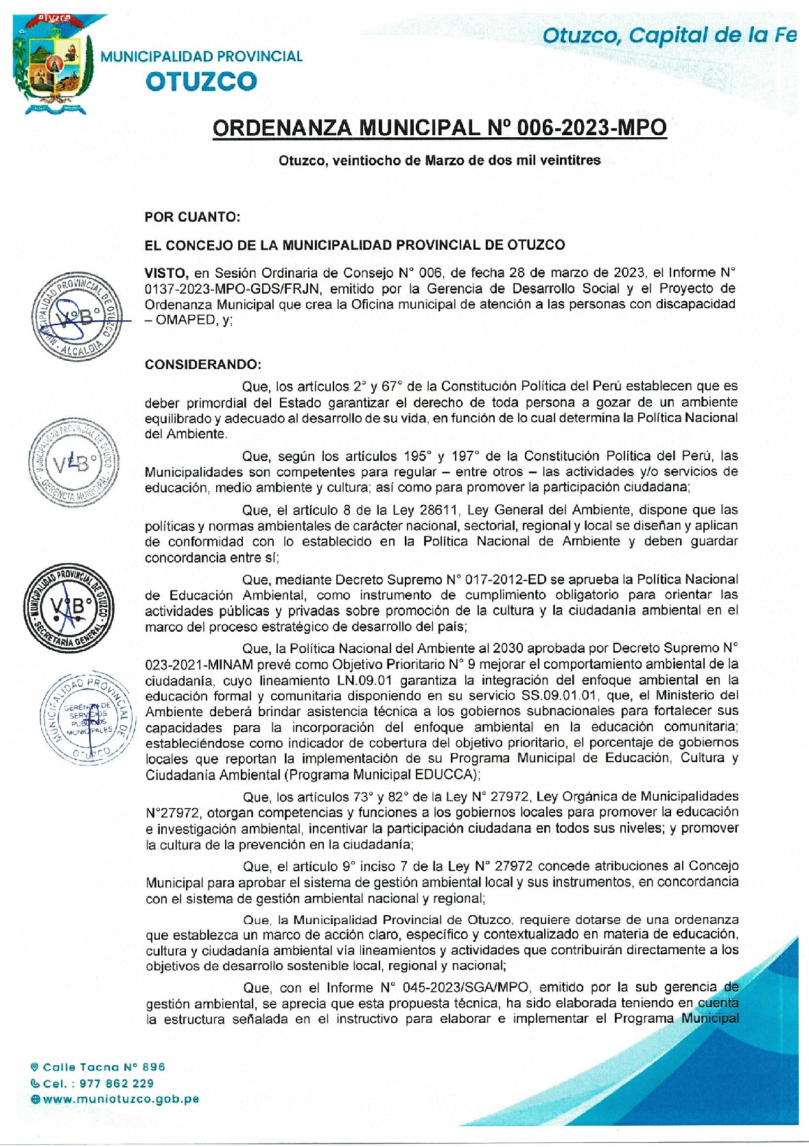 La presente Ordenanza aprueba el Programa Municipal de Educación, Cultura y Ciudadanía Ambiental de la Municipalidad Provincial de Otuzco - (La Libertad), con la finalidad de promover la cultura y la educación ambiental para la formación de ciudadanas y ciudadanos ambientalmente responsables e incentivar la participación ciudadana en todos sus niveles.