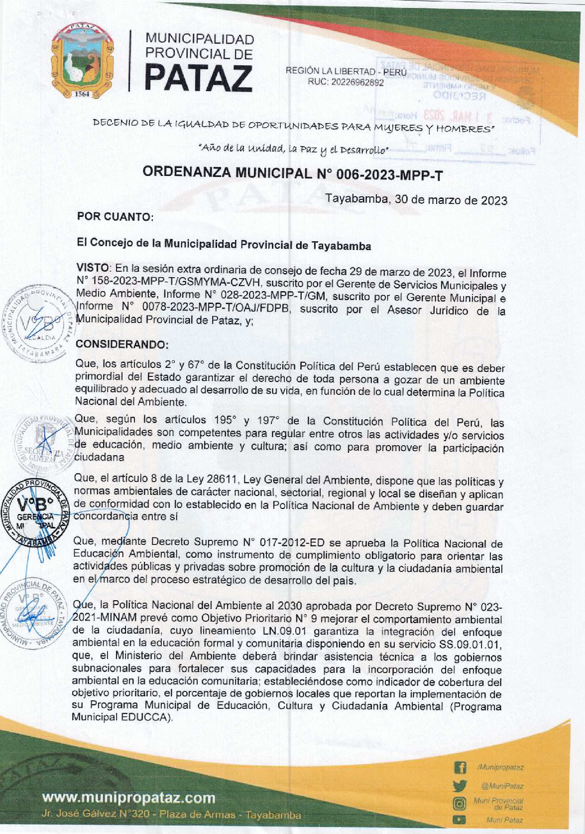 La presente Ordenanza aprueba el Programa Municipal de Educación, Cultura y Ciudadanía Ambiental de la Municipalidad Provincial de Pataz - (La Libertad), con la finalidad de promover la cultura y la educación ambiental para la formación de ciudadanas y ciudadanos ambientalmente responsables e incentivar la participación ciudadana en todos sus niveles.