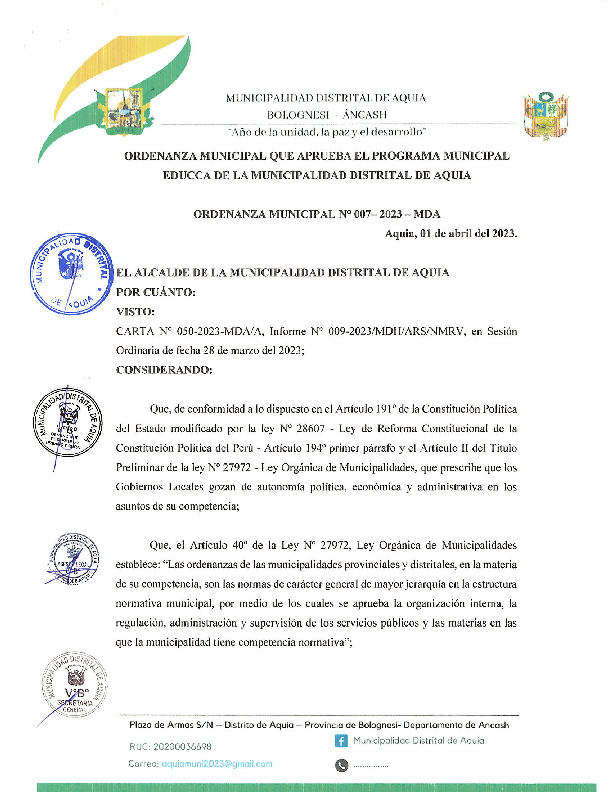 La presente Ordenanza aprueba el Programa Municipal de Educación, Cultura y Ciudadanía Ambiental de la Municipalidad Distrital de Aquia - Bolognesi (Áncash), con la finalidad de promover la cultura y la educación ambiental para la formación de ciudadanas y ciudadanos ambientalmente responsables e incentivar la participación ciudadana en todos sus niveles.