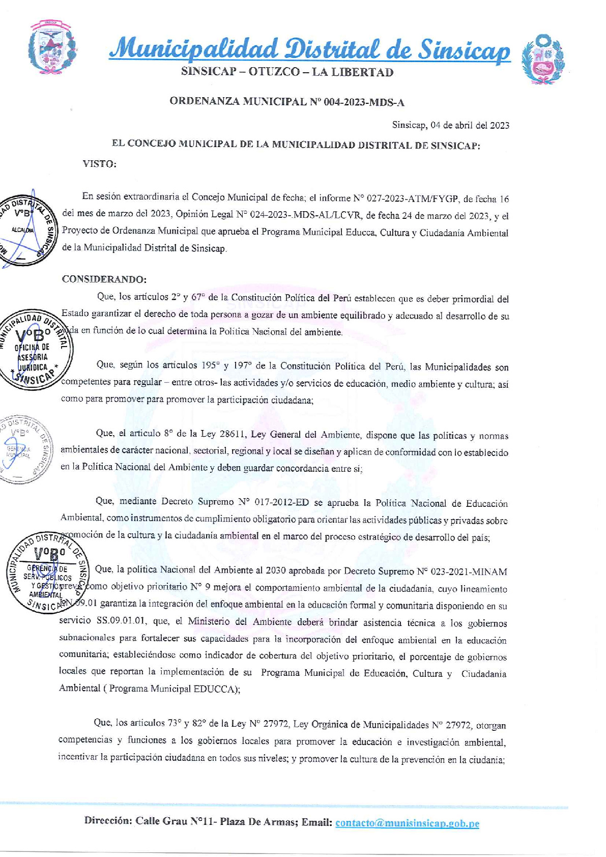 La presente Ordenanza aprueba el Programa Municipal de Educación, Cultura y Ciudadanía Ambiental de la Municipalidad Distrital de Sinsicap - Otuzco (La Libertad), con la finalidad de promover la cultura y la educación ambiental para la formación de ciudadanas y ciudadanos ambientalmente responsables e incentivar la participación ciudadana en todos sus niveles.