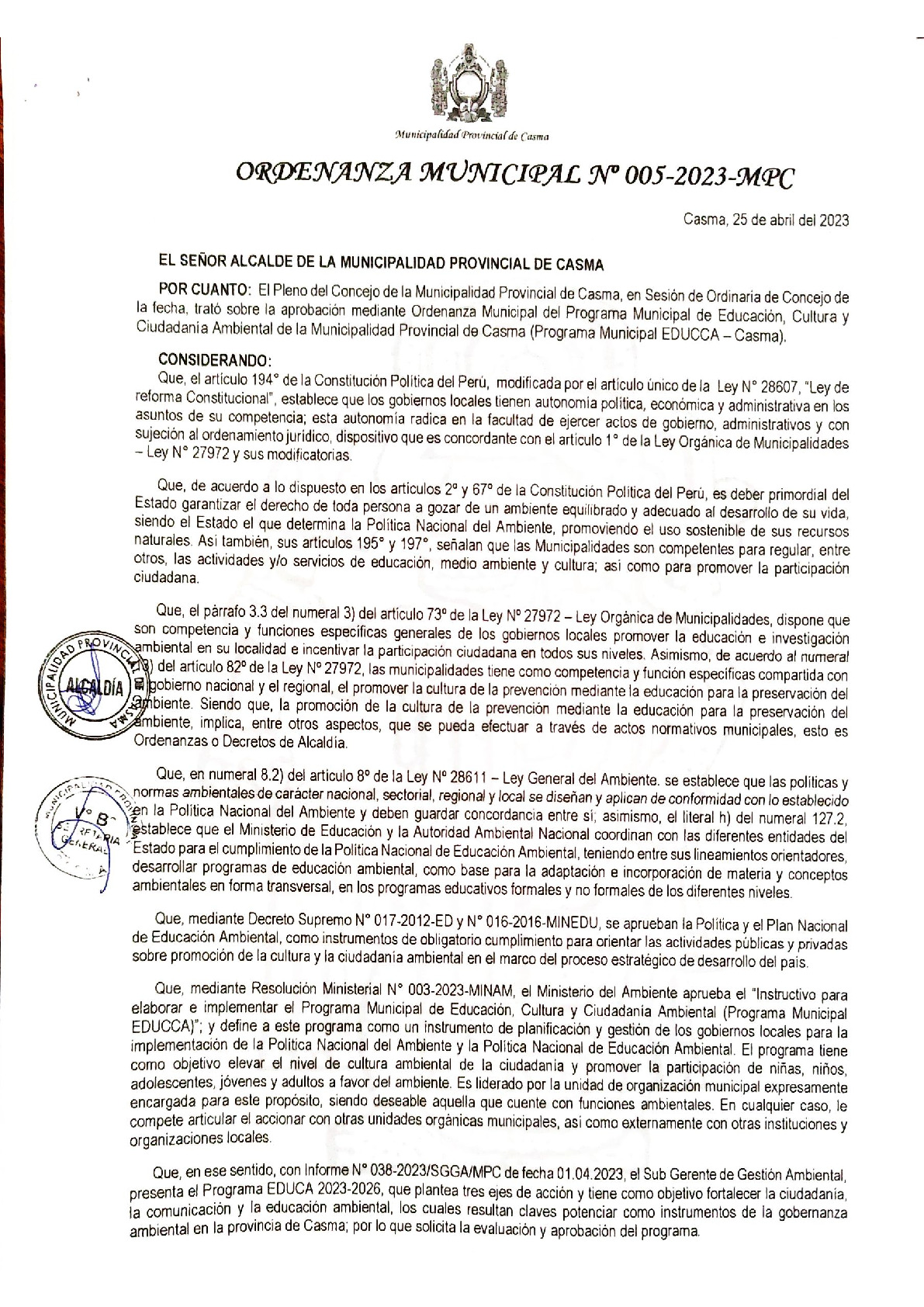 La presente Ordenanza aprueba el Programa Municipal de Educación, Cultura y Ciudadanía Ambiental de la Municipalidad Provincial de Casma - (Áncash), con la finalidad de promover la cultura y la educación ambiental para la formación de ciudadanas y ciudadanos ambientalmente responsables e incentivar la participación ciudadana en todos sus niveles.