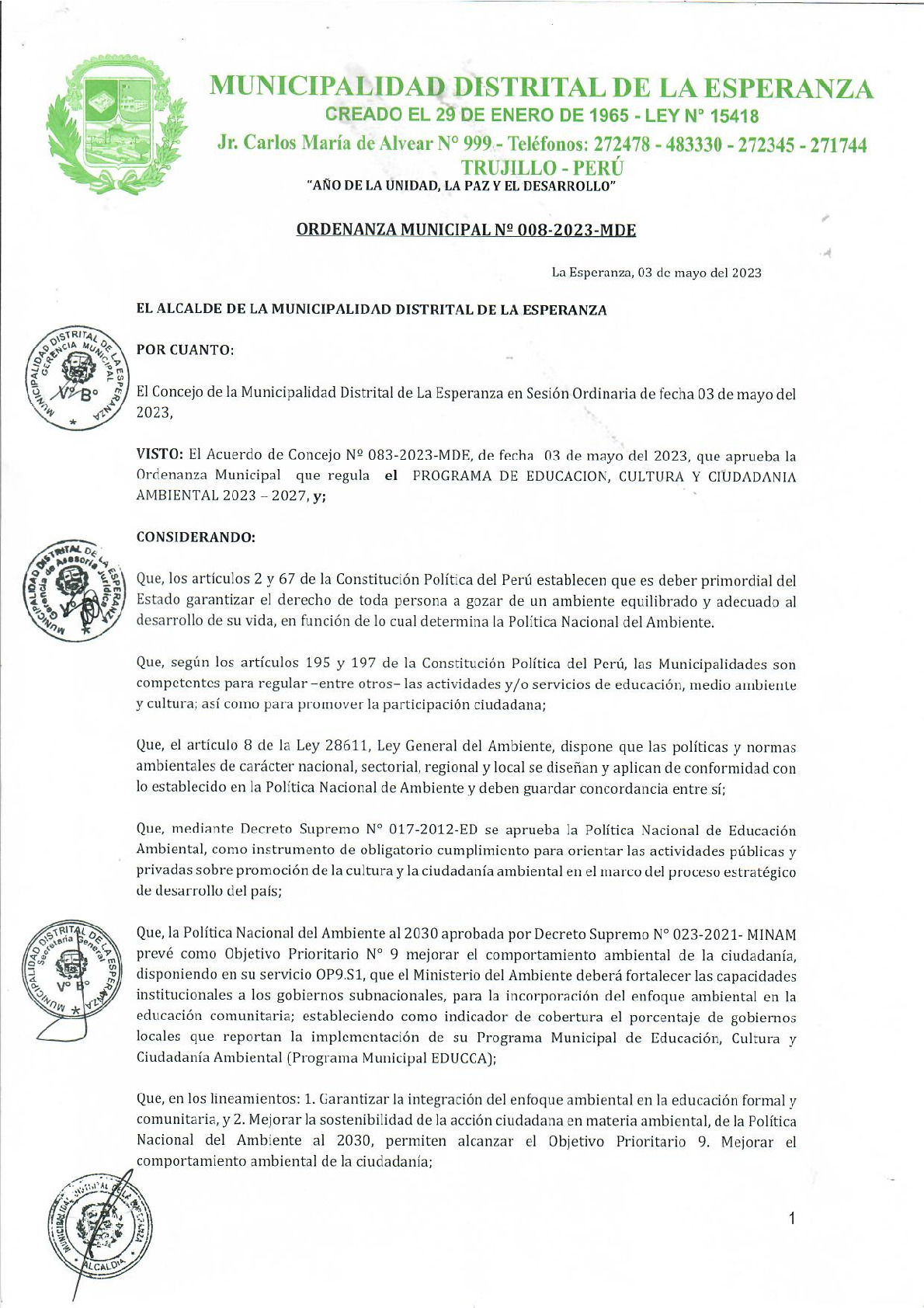 La presente Ordenanza aprueba el Programa Municipal de Educación, Cultura y Ciudadanía Ambiental de la Municipalidad Distrital de La Esperanza - Trujillo (La Libertad), con la finalidad de promover la cultura y la educación ambiental para la formación de ciudadanas y ciudadanos ambientalmente responsables e incentivar la participación ciudadana en todos sus niveles.