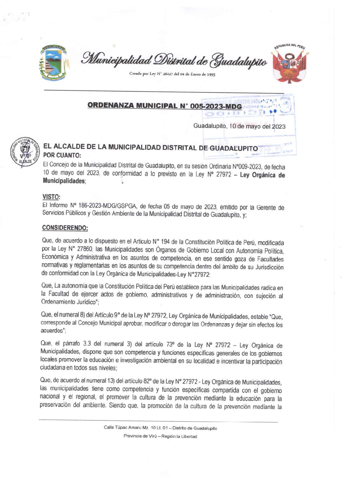 La presente Ordenanza aprueba el Programa Municipal de Educación, Cultura y Ciudadanía Ambiental de la Municipalidad Distrital de Guadalupito - Viru (La Libertad), con la finalidad de promover la cultura y la educación ambiental para la formación de ciudadanas y ciudadanos ambientalmente responsables e incentivar la participación ciudadana en todos sus niveles.