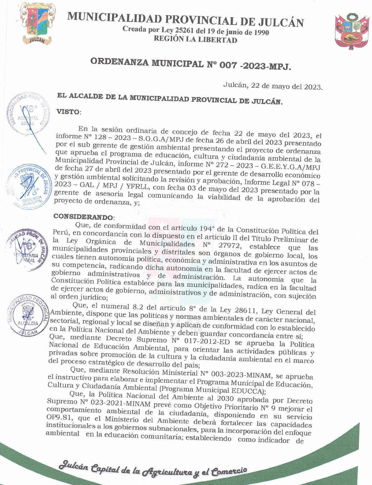 La presente Ordenanza aprueba el Programa Municipal de Educación, Cultura y Ciudadanía Ambiental de la Municipalidad Provincial de Julcán - (La Libertad), con la finalidad de promover la cultura y la educación ambiental para la formación de ciudadanas y ciudadanos ambientalmente responsables e incentivar la participación ciudadana en todos sus niveles.
