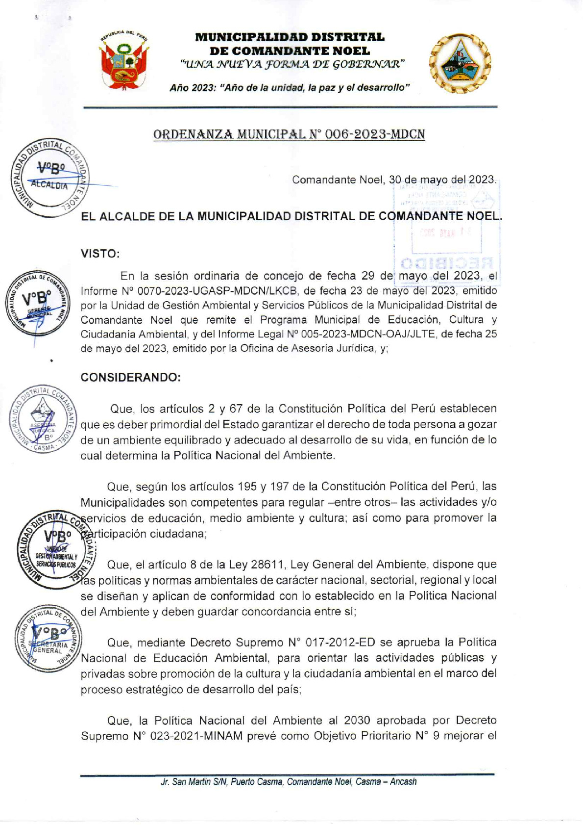 La presente Ordenanza aprueba el Programa Municipal de Educación, Cultura y Ciudadanía Ambiental de la Municipalidad Distrital de Comandante Noel - Casma (Áncash), con la finalidad de promover la cultura y la educación ambiental para la formación de ciudadanas y ciudadanos ambientalmente responsables e incentivar la participación ciudadana en todos sus niveles.