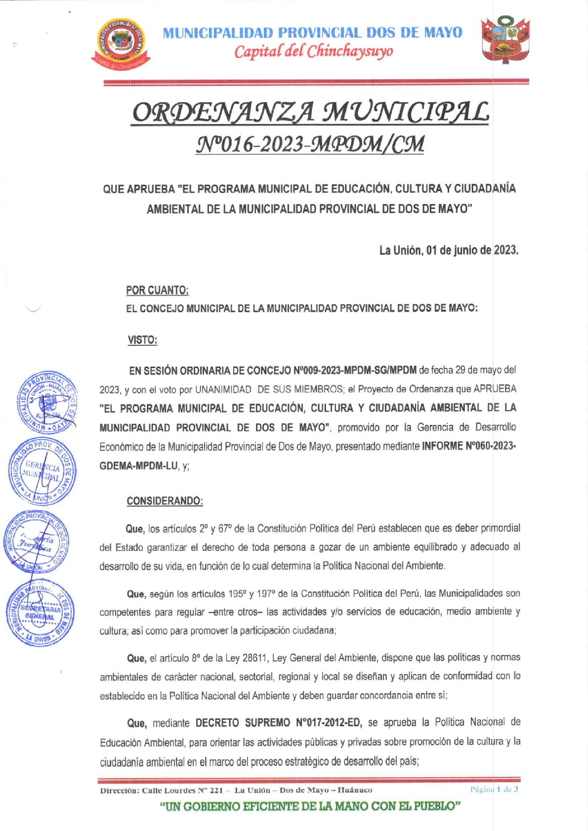 Programa Municipal de Educación, Cultura y Ciudadanía Ambiental de la Municipalidad Provincial de Dos de Mayo