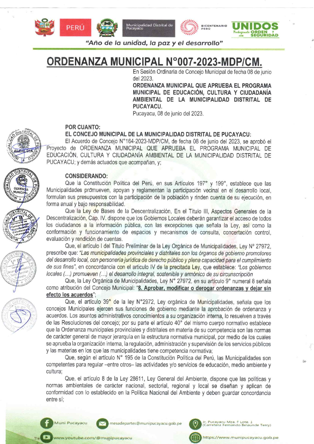 La presente Ordenanza aprueba el Programa Municipal de Educación, Cultura y Ciudadanía Ambiental de la Municipalidad Distrital de Pucayacu - Leoncio Prado (Huánuco), con la finalidad de promover la cultura y la educación ambiental para la formación de ciudadanas y ciudadanos ambientalmente responsables e incentivar la participación ciudadana en todos sus niveles.