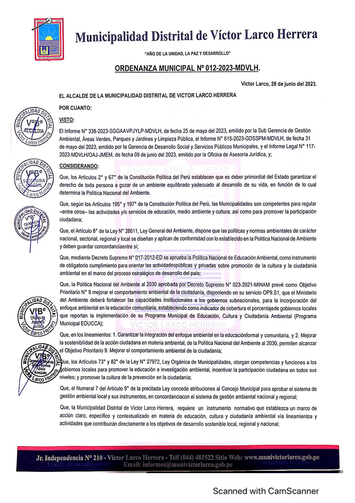 La presente Ordenanza aprueba el Programa Municipal de Educación, Cultura y Ciudadanía Ambiental de la Municipalidad Distrital de Víctor Larco Herrera - Trujillo (La Libertad), con la finalidad de promover la cultura y la educación ambiental para la formación de ciudadanas y ciudadanos ambientalmente responsables e incentivar la participación ciudadana en todos sus niveles.