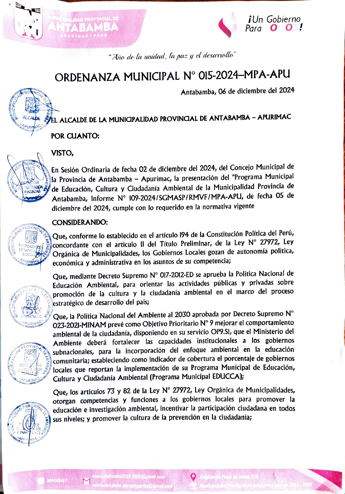 La presente Ordenanza aprueba el Programa Municipal de Educación, Cultura y Ciudadanía Ambiental de la Municipalidad Provincial de Antabamba - (Apurímac), con la finalidad de promover la cultura y la educación ambiental para la formación de ciudadanas y ciudadanos ambientalmente responsables e incentivar la participación ciudadana en todos sus niveles.