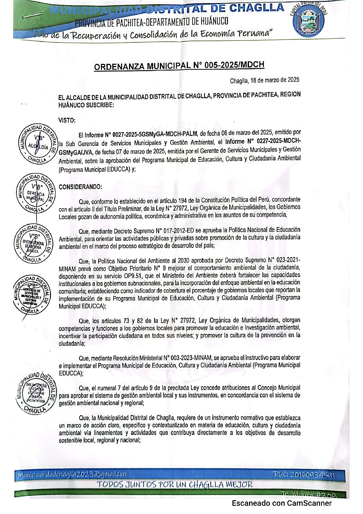 La presente Ordenanza aprueba el Programa Municipal de Educación, Cultura y Ciudadanía Ambiental de la Municipalidad Distrital de Chaglla - Pachitea (Huánuco), con la finalidad de promover la cultura y la educación ambiental para la formación de ciudadanas y ciudadanos ambientalmente responsables e incentivar la participación ciudadana en todos sus niveles.