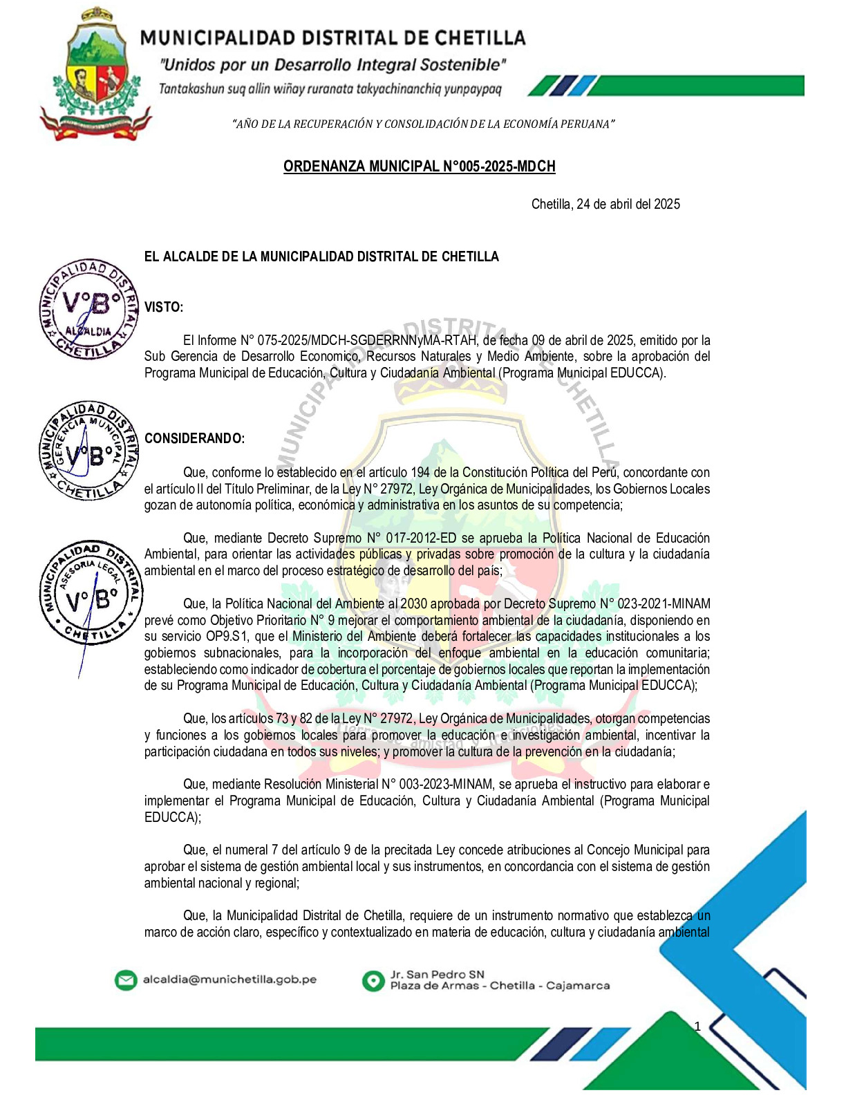 La presente Ordenanza aprueba el Programa Municipal de Educación, Cultura y Ciudadanía Ambiental de la Municipalidad Distrital de Chetilla - Cajamarca (Cajamarca), con la finalidad de promover la cultura y la educación ambiental para la formación de ciudadanas y ciudadanos ambientalmente responsables e incentivar la participación ciudadana en todos sus niveles.