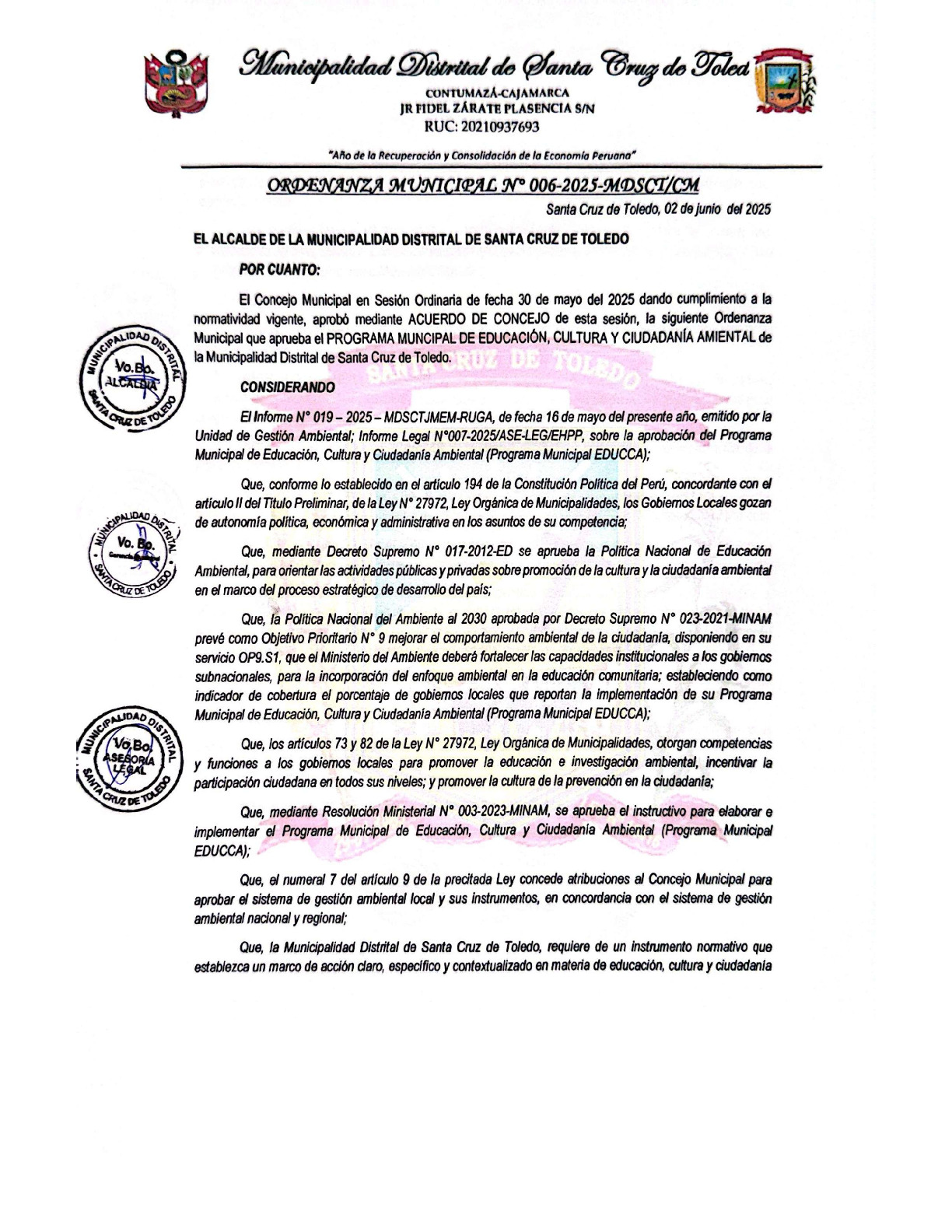 La presente Ordenanza aprueba el Programa Municipal de Educación, Cultura y Ciudadanía Ambiental de la Municipalidad Distrital de Santa Cruz de Toledo - Contumazá (Cajamarca), con la finalidad de promover la cultura y la educación ambiental para la formación de ciudadanas y ciudadanos ambientalmente responsables e incentivar la participación ciudadana en todos sus niveles.