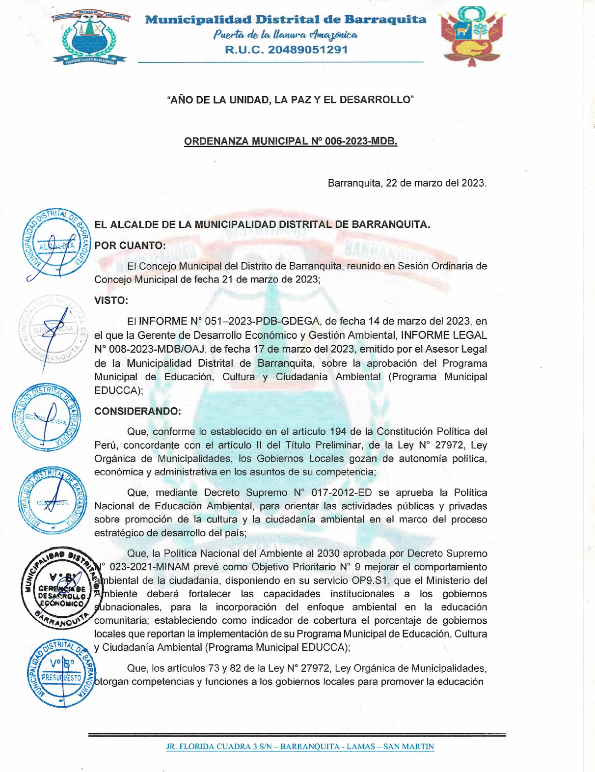 La presente Ordenanza aprueba el Programa Municipal de Educación, Cultura y Ciudadanía Ambiental de la Municipalidad Distrital de Barranquita - Lamas (San Martín), con la finalidad de promover la cultura y la educación ambiental para la formación de ciudadanas y ciudadanos ambientalmente responsables e incentivar la participación ciudadana en todos sus niveles.