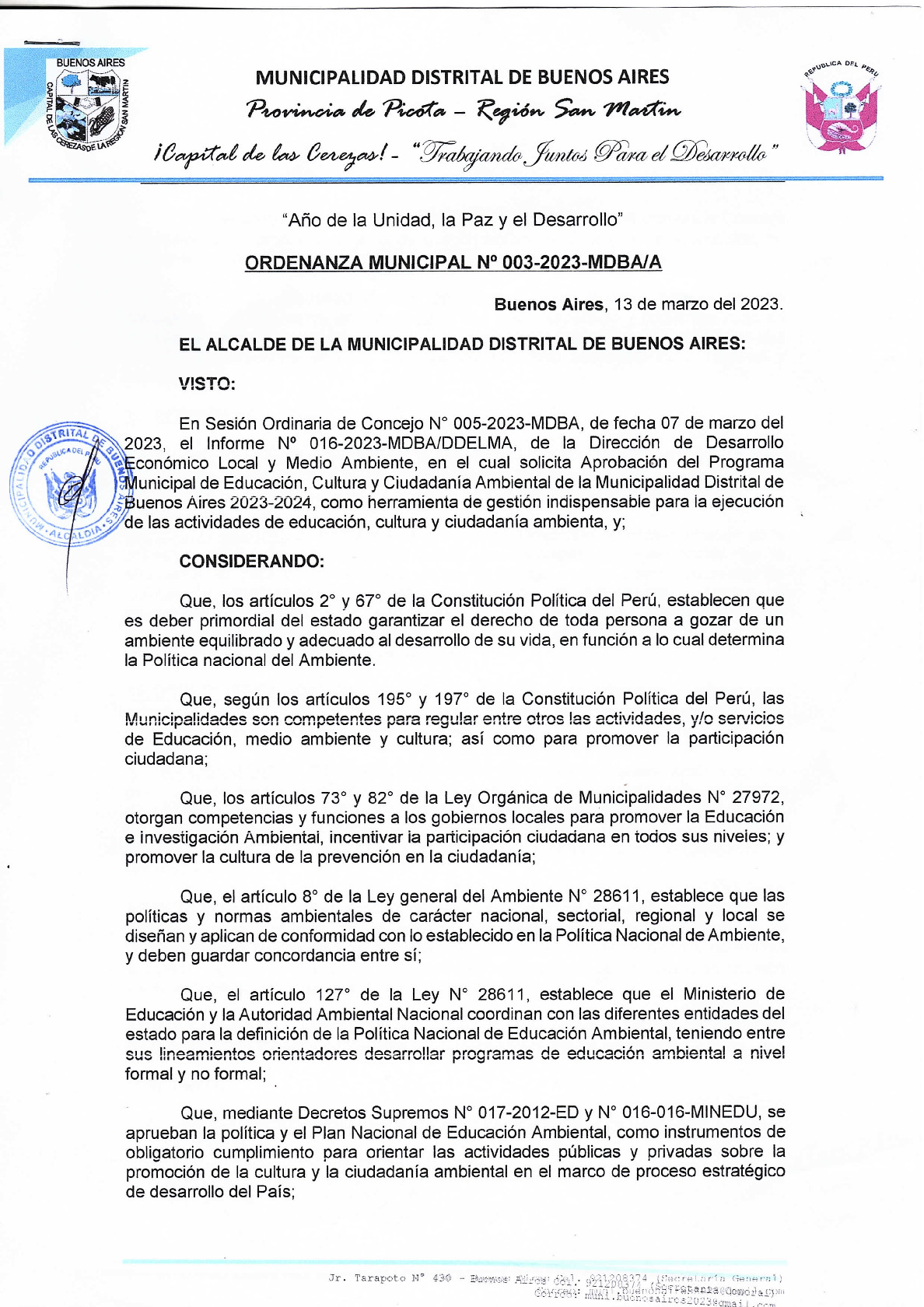 La presente Ordenanza aprueba el Programa Municipal de Educación, Cultura y Ciudadanía Ambiental de la Municipalidad Distrital de Buenos Aires - Picota (San Martín), con la finalidad de promover la cultura y la educación ambiental para la formación de ciudadanas y ciudadanos ambientalmente responsables e incentivar la participación ciudadana en todos sus niveles.