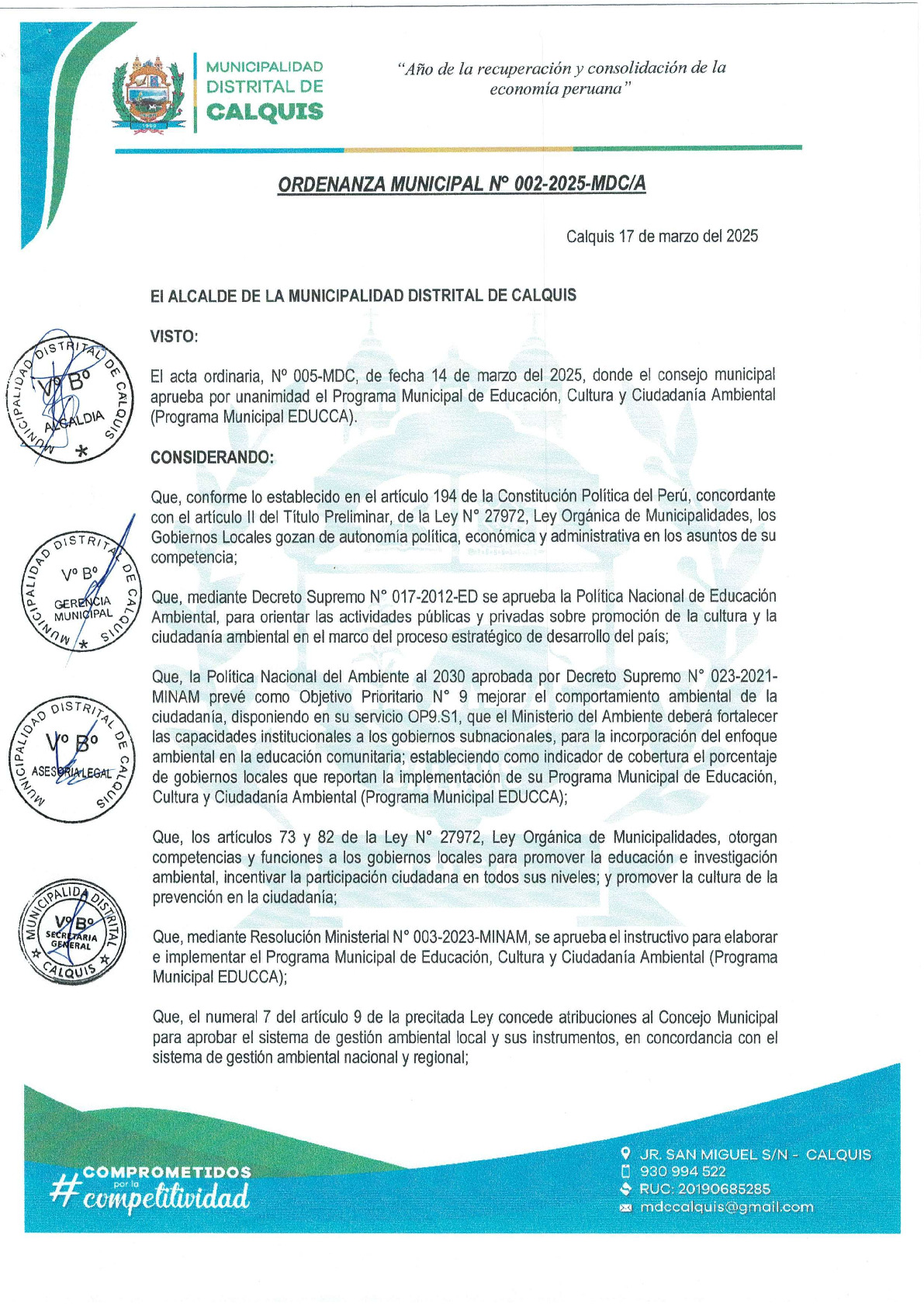 La presente Ordenanza aprueba el Programa Municipal de Educación, Cultura y Ciudadanía Ambiental de la Municipalidad Distrital de Calquis - San Miguel (Cajamarca), con la finalidad de promover la cultura y la educación ambiental para la formación de ciudadanas y ciudadanos ambientalmente responsables e incentivar la participación ciudadana en todos sus niveles.