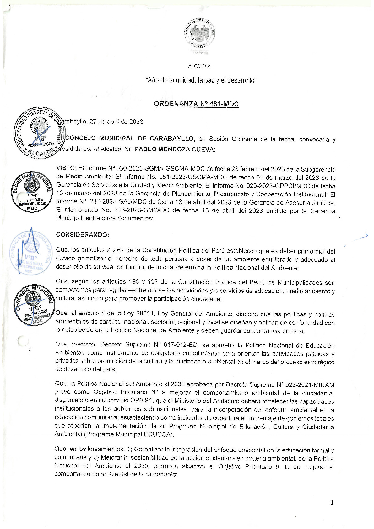 La presente Ordenanza aprueba el Programa Municipal de Educación, Cultura y Ciudadanía Ambiental de la Municipalidad Distrital de Carabayllo - Lima (Lima Metropolitana), con la finalidad de promover la cultura y la educación ambiental para la formación de ciudadanas y ciudadanos ambientalmente responsables e incentivar la participación ciudadana en todos sus niveles.
