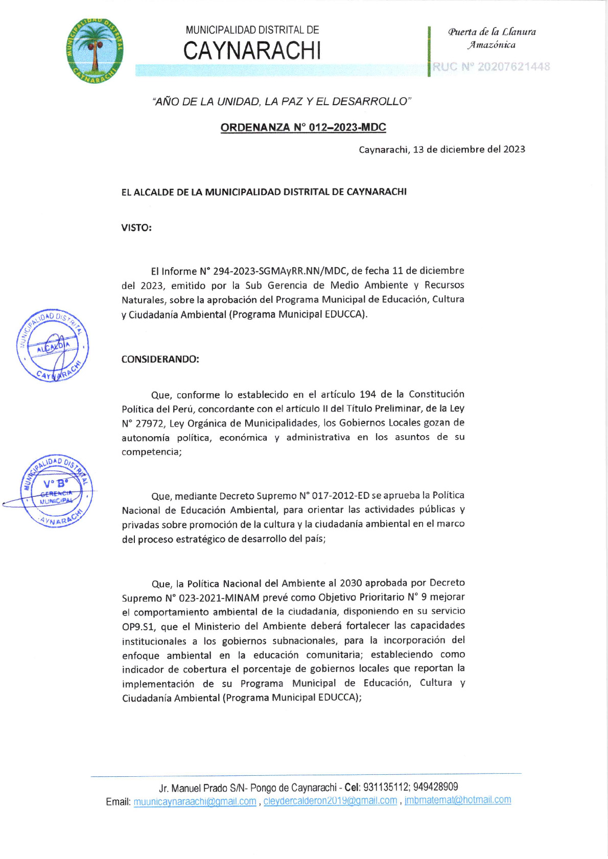 Programa Municipal de Educación, Cultura y Ciudadanía Ambiental de la Municipalidad Distrital de Caynarachi