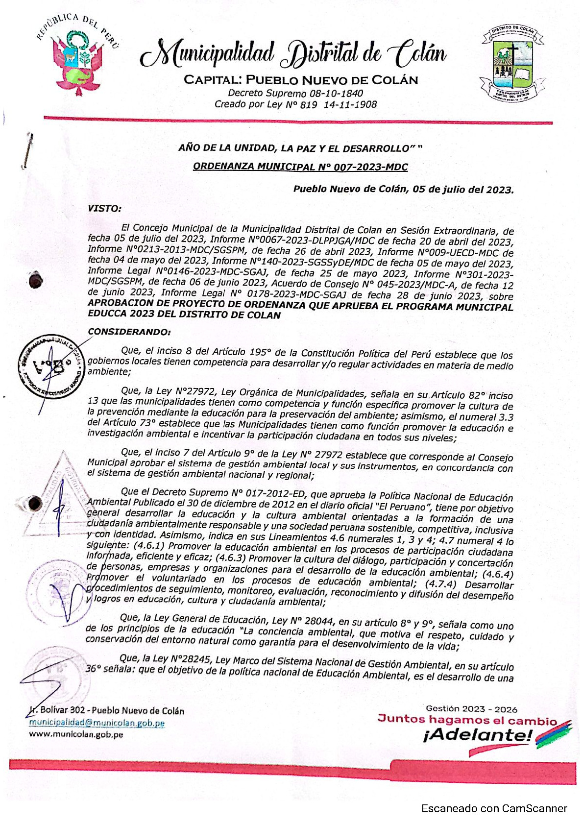 La presente Ordenanza aprueba el Programa Municipal de Educación, Cultura y Ciudadanía Ambiental de la Municipalidad Distrital de Colán - Paita (Piura), con la finalidad de promover la cultura y la educación ambiental para la formación de ciudadanas y ciudadanos ambientalmente responsables e incentivar la participación ciudadana en todos sus niveles.