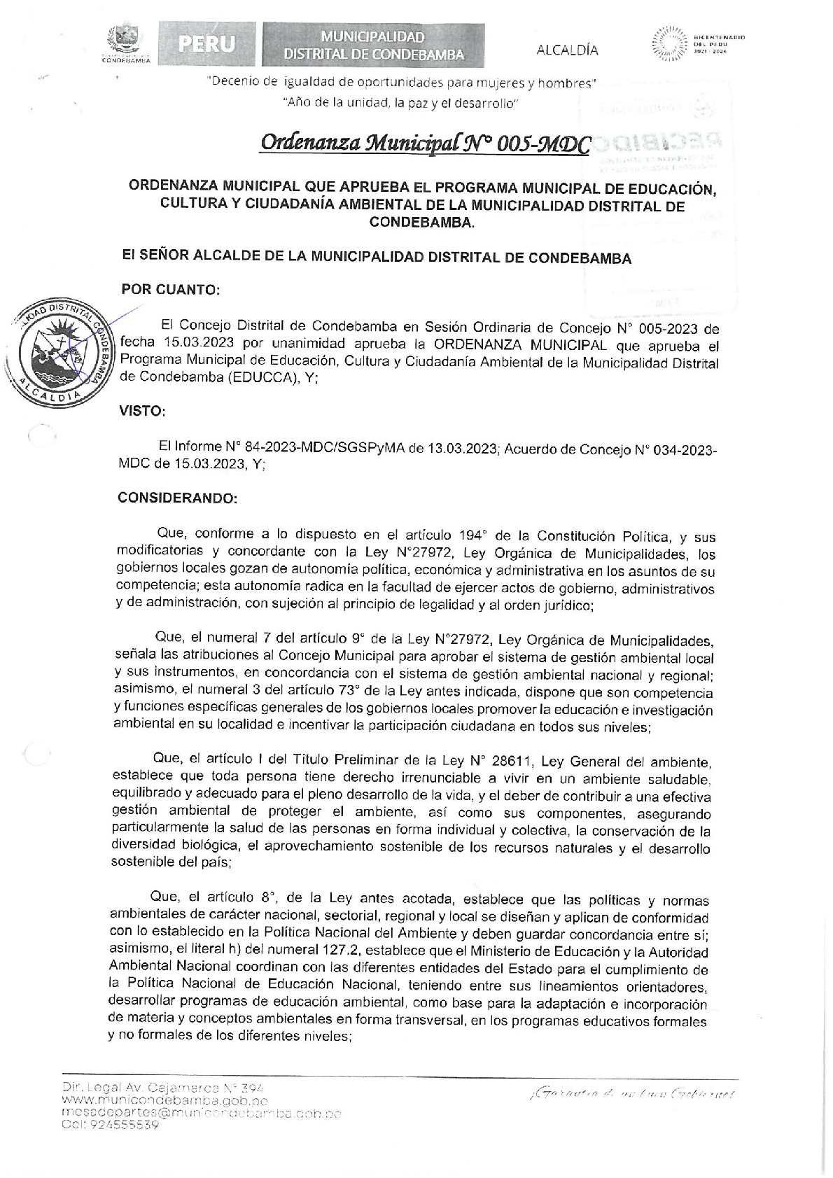 La presente Ordenanza aprueba el Programa Municipal de Educación, Cultura y Ciudadanía Ambiental de la Municipalidad Distrital de Condebamba - Cajabamba (Cajamarca), con la finalidad de promover la cultura y la educación ambiental para la formación de ciudadanas y ciudadanos ambientalmente responsables e incentivar la participación ciudadana en todos sus niveles.