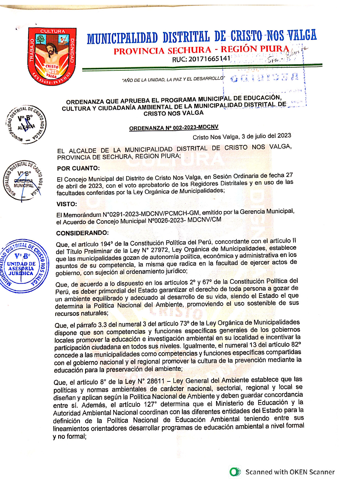 La presente Ordenanza aprueba el Programa Municipal de Educación, Cultura y Ciudadanía Ambiental de la Municipalidad Distrital de Cristo Nos Valga - Sechura (Piura), con la finalidad de promover la cultura y la educación ambiental para la formación de ciudadanas y ciudadanos ambientalmente responsables e incentivar la participación ciudadana en todos sus niveles.