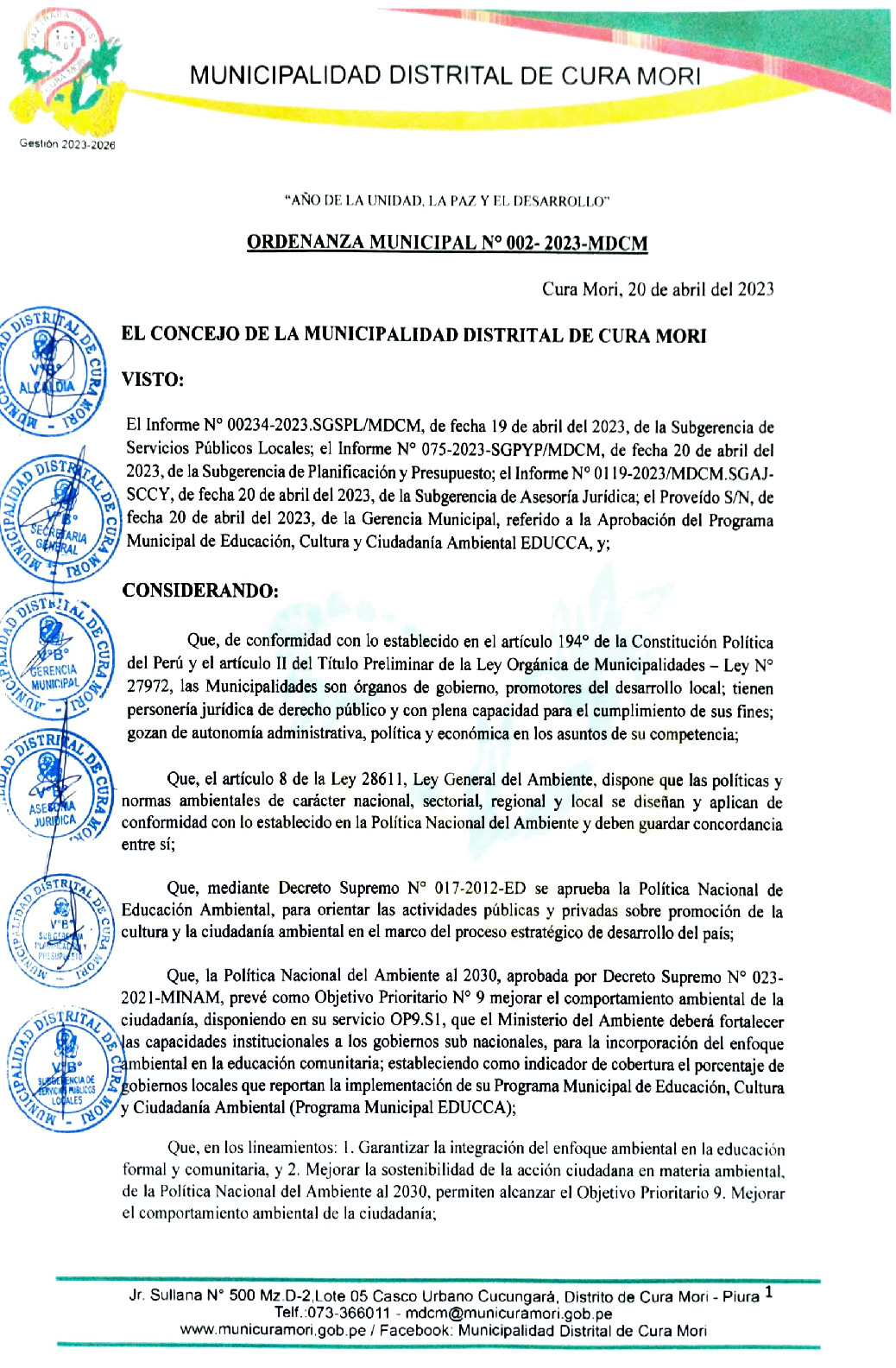 La presente Ordenanza aprueba el Programa Municipal de Educación, Cultura y Ciudadanía Ambiental de la Municipalidad Distrital de Cura Mori - Piura (Piura), con la finalidad de promover la cultura y la educación ambiental para la formación de ciudadanas y ciudadanos ambientalmente responsables e incentivar la participación ciudadana en todos sus niveles.