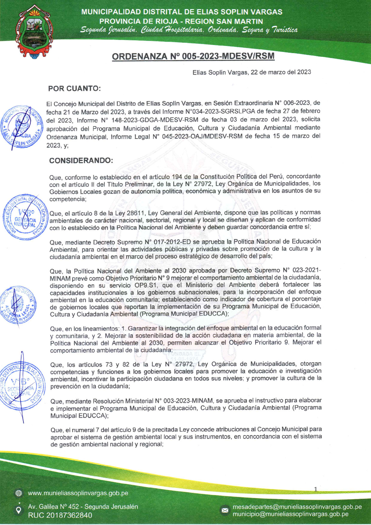 La presente Ordenanza aprueba el Programa Municipal de Educación, Cultura y Ciudadanía Ambiental de la Municipalidad Distrital de Elías Soplín Vargas - Rioja (San Martín), con la finalidad de promover la cultura y la educación ambiental para la formación de ciudadanas y ciudadanos ambientalmente responsables e incentivar la participación ciudadana en todos sus niveles.