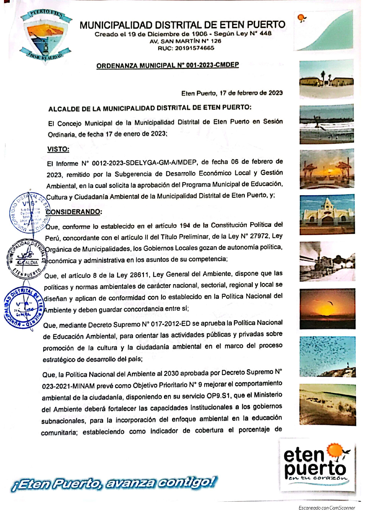 La presente Ordenanza aprueba el Programa Municipal de Educación, Cultura y Ciudadanía Ambiental de la Municipalidad Distrital de Eten Puerto - Chiclayo (Lambayeque), con la finalidad de promover la cultura y la educación ambiental para la formación de ciudadanas y ciudadanos ambientalmente responsables e incentivar la participación ciudadana en todos sus niveles.
