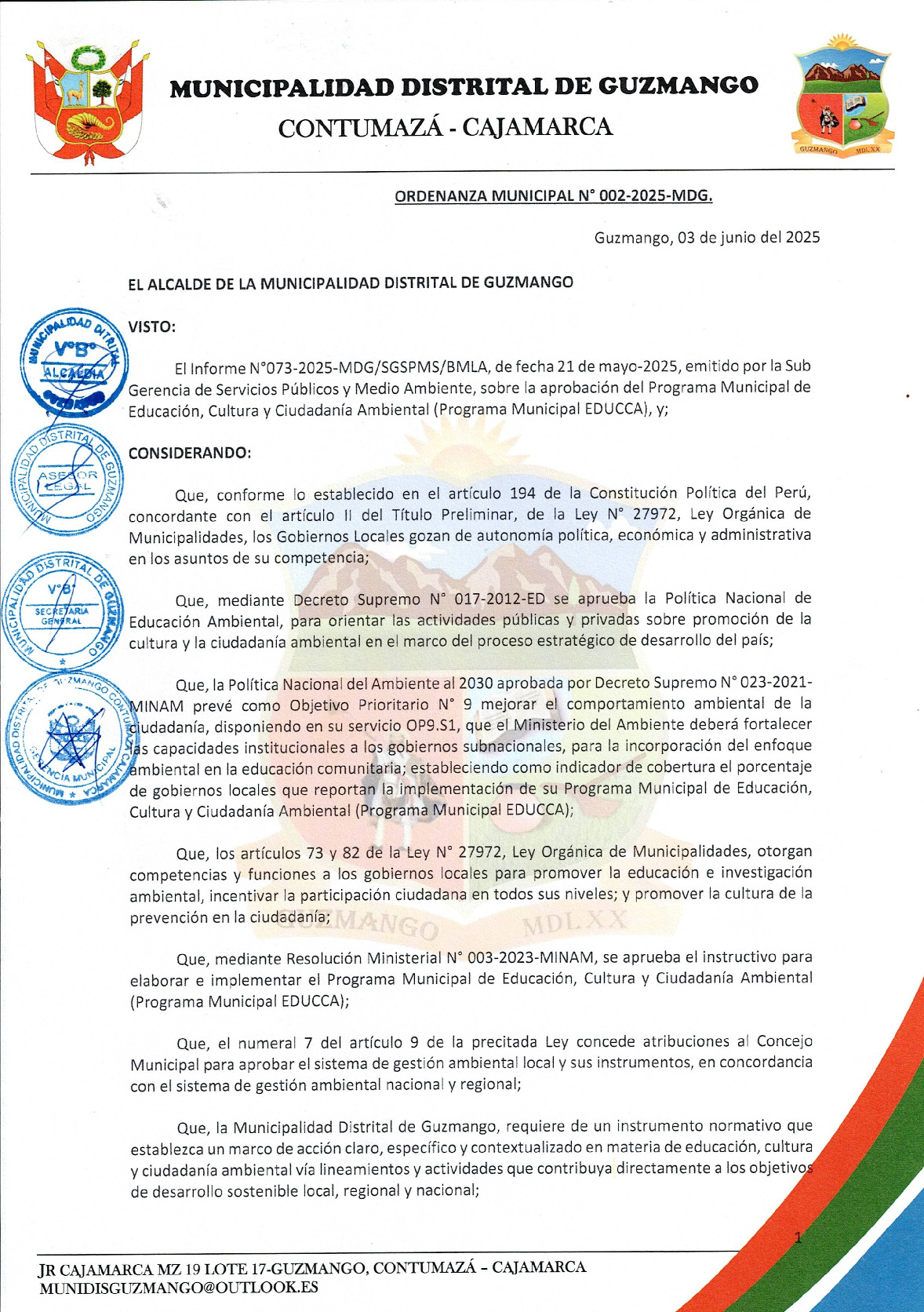 La presente Ordenanza aprueba el Programa Municipal de Educación, Cultura y Ciudadanía Ambiental de la Municipalidad Distrital de Guzmango - Contumazá (Cajamarca), con la finalidad de promover la cultura y la educación ambiental para la formación de ciudadanas y ciudadanos ambientalmente responsables e incentivar la participación ciudadana en todos sus niveles.