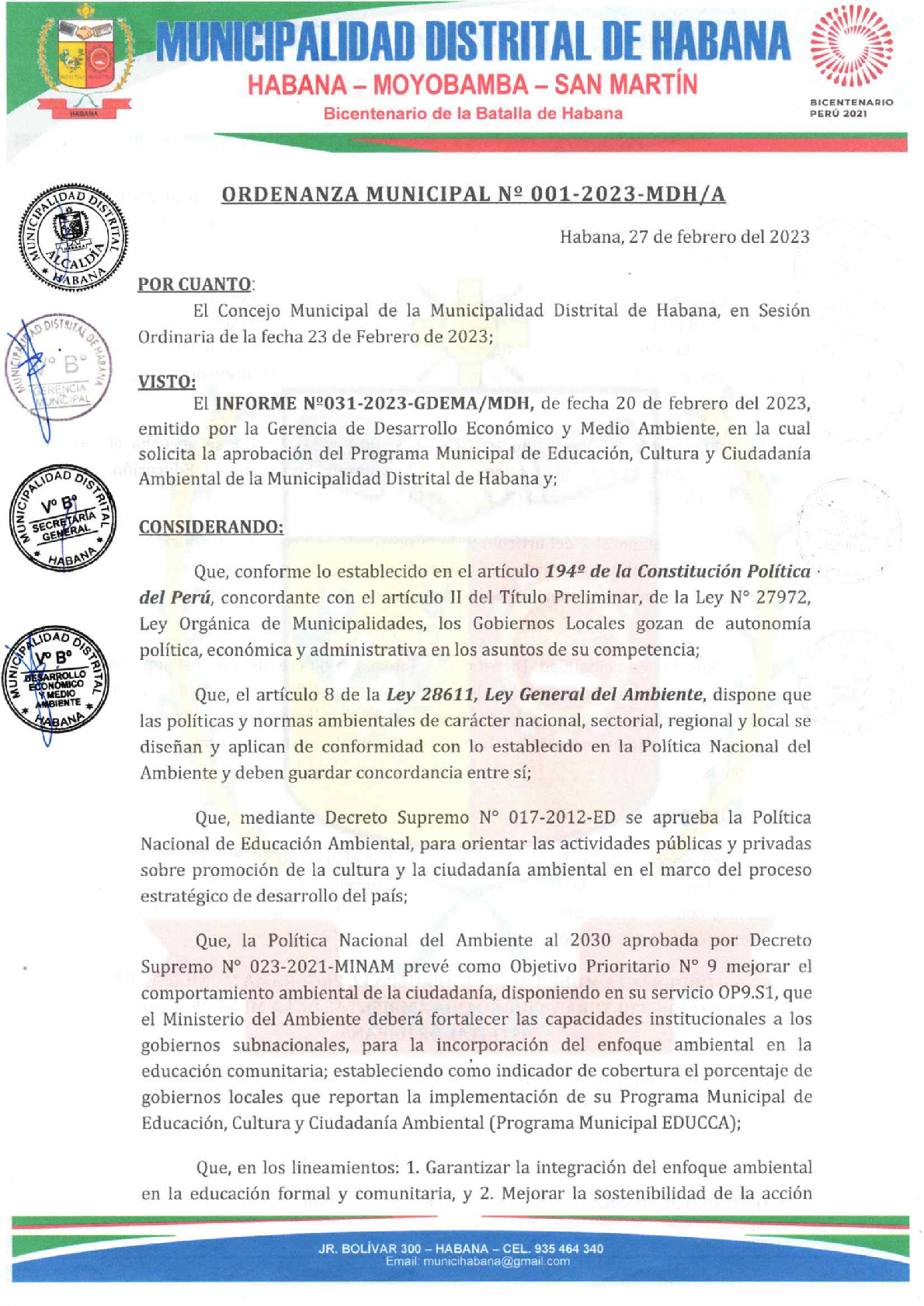 La presente Ordenanza aprueba el Programa Municipal de Educación, Cultura y Ciudadanía Ambiental de la Municipalidad Distrital de Habana - Moyobamba (San Martín), con la finalidad de promover la cultura y la educación ambiental para la formación de ciudadanas y ciudadanos ambientalmente responsables e incentivar la participación ciudadana en todos sus niveles.