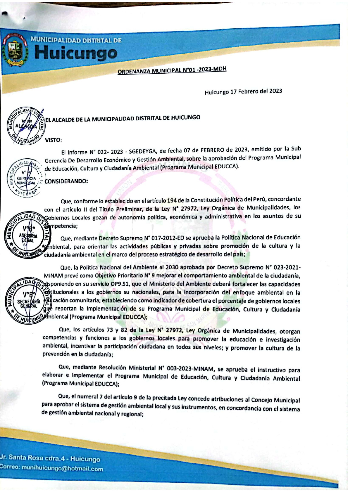 La presente Ordenanza aprueba el Programa Municipal de Educación, Cultura y Ciudadanía Ambiental de la Municipalidad Distrital de Huicungo - Mariscal Cáceres (San Martín), con la finalidad de promover la cultura y la educación ambiental para la formación de ciudadanas y ciudadanos ambientalmente responsables e incentivar la participación ciudadana en todos sus niveles.