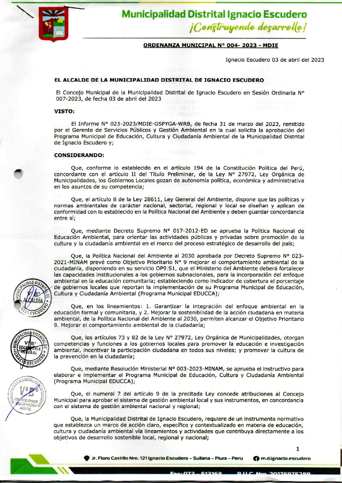 La presente Ordenanza aprueba el Programa Municipal de Educación, Cultura y Ciudadanía Ambiental de la Municipalidad Distrital de Ignacio Escudero - Sullana (Piura), con la finalidad de promover la cultura y la educación ambiental para la formación de ciudadanas y ciudadanos ambientalmente responsables e incentivar la participación ciudadana en todos sus niveles.