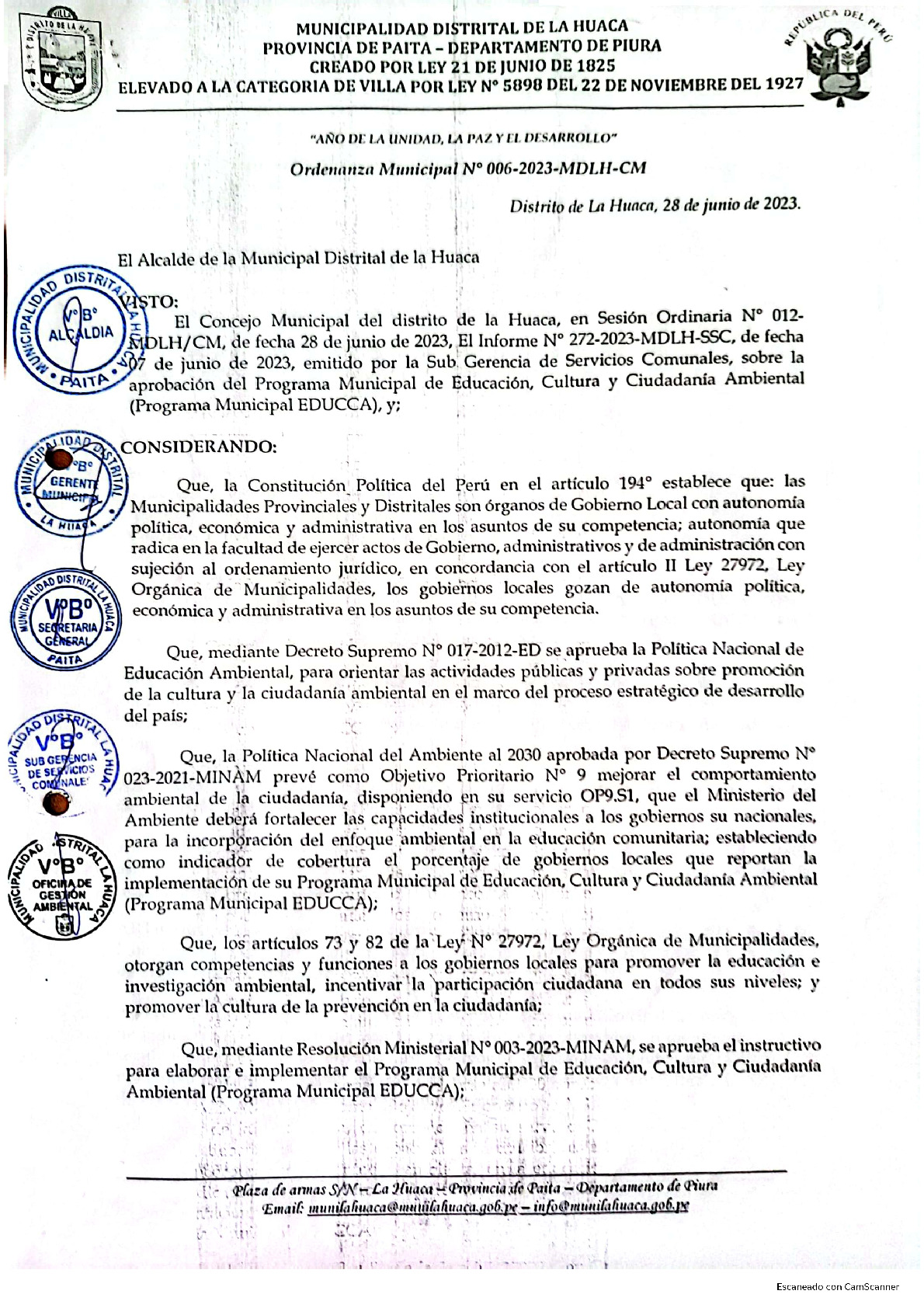 La presente Ordenanza aprueba el Programa Municipal de Educación, Cultura y Ciudadanía Ambiental de la Municipalidad Distrital de La Huaca - Paita (Piura), con la finalidad de promover la cultura y la educación ambiental para la formación de ciudadanas y ciudadanos ambientalmente responsables e incentivar la participación ciudadana en todos sus niveles.