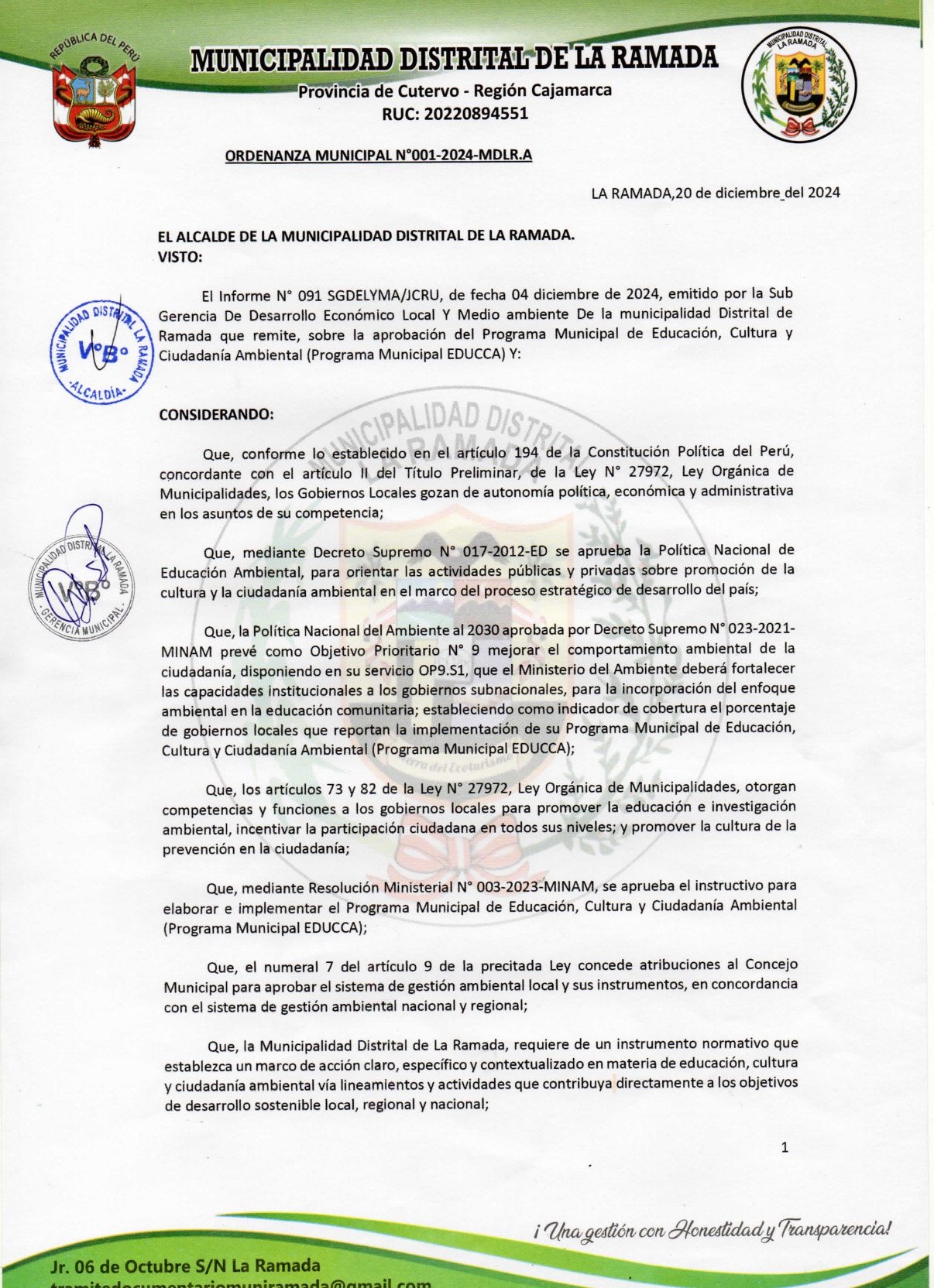 La presente Ordenanza aprueba el Programa Municipal de Educación, Cultura y Ciudadanía Ambiental de la Municipalidad Distrital de La Ramada - Cutervo (Cajamarca), con la finalidad de promover la cultura y la educación ambiental para la formación de ciudadanas y ciudadanos ambientalmente responsables e incentivar la participación ciudadana en todos sus niveles.