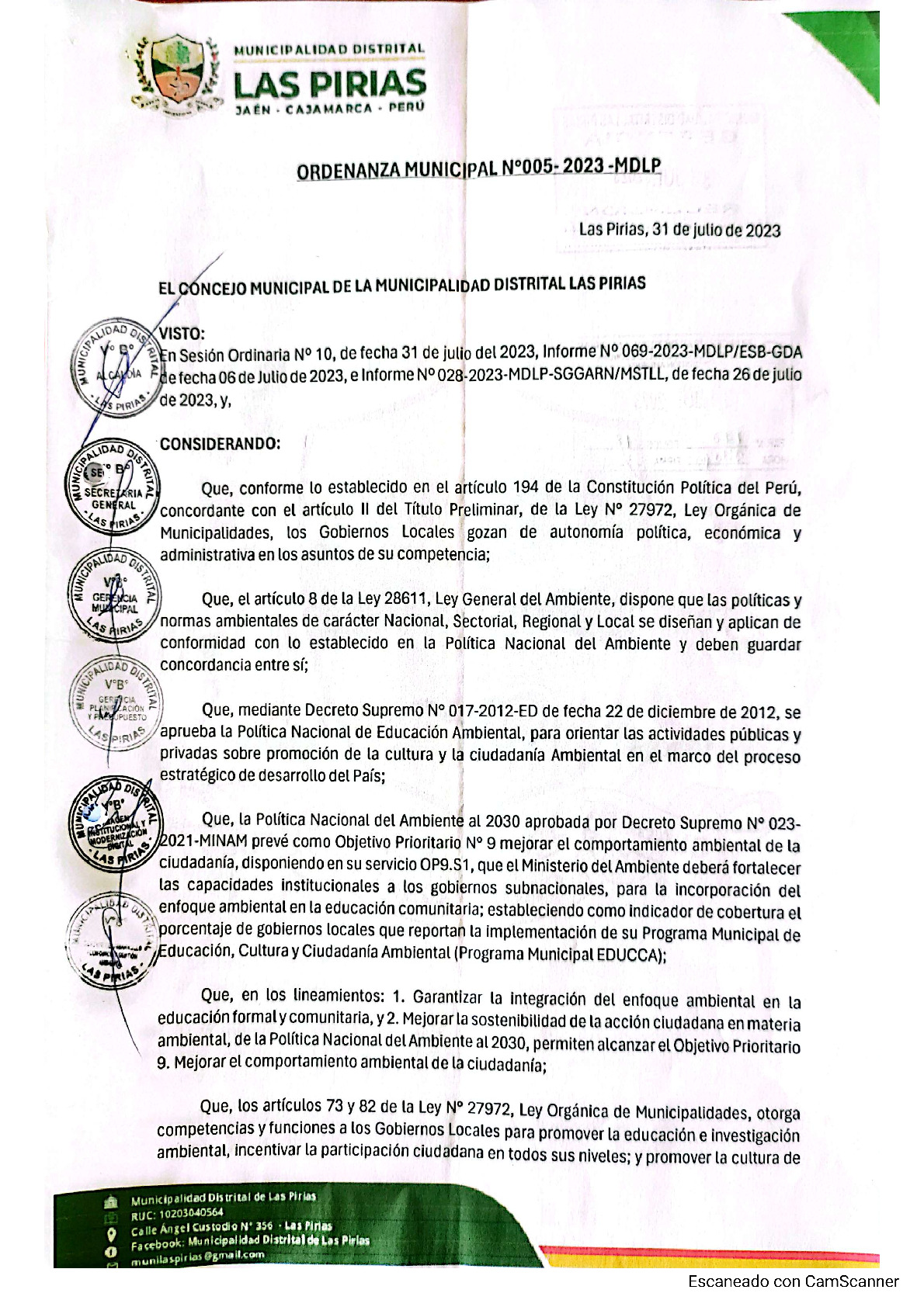 La presente Ordenanza aprueba el Programa Municipal de Educación, Cultura y Ciudadanía Ambiental de la Municipalidad Distrital de Las Pirias - Jaén (Cajamarca), con la finalidad de promover la cultura y la educación ambiental para la formación de ciudadanas y ciudadanos ambientalmente responsables e incentivar la participación ciudadana en todos sus niveles.