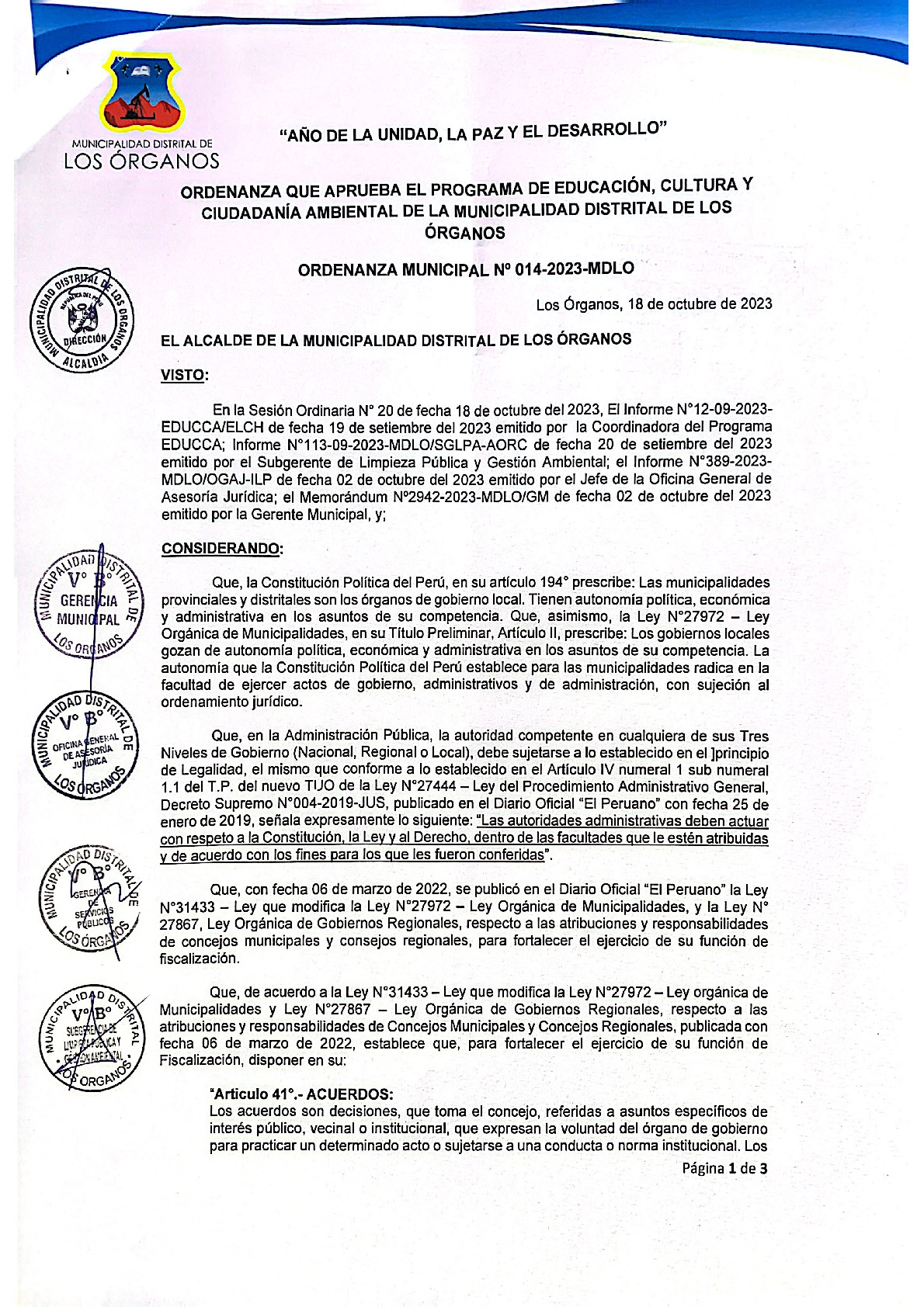 La presente Ordenanza aprueba el Programa Municipal de Educación, Cultura y Ciudadanía Ambiental de la Municipalidad Distrital de Los Órganos - Talara (Piura), con la finalidad de promover la cultura y la educación ambiental para la formación de ciudadanas y ciudadanos ambientalmente responsables e incentivar la participación ciudadana en todos sus niveles.