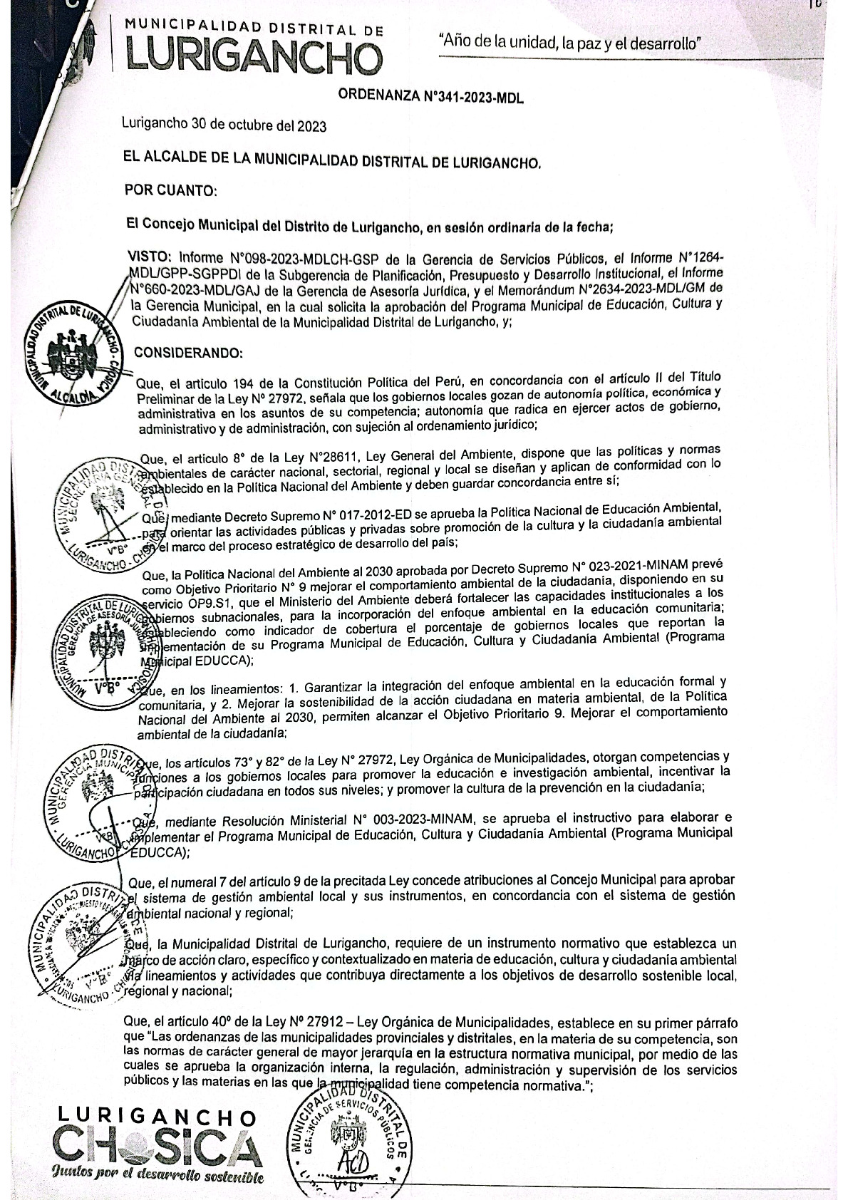 La presente Ordenanza aprueba el Programa Municipal de Educación, Cultura y Ciudadanía Ambiental de la Municipalidad Distrital de Lurigancho - Lima (Lima Metropolitana), con la finalidad de promover la cultura y la educación ambiental para la formación de ciudadanas y ciudadanos ambientalmente responsables e incentivar la participación ciudadana en todos sus niveles.