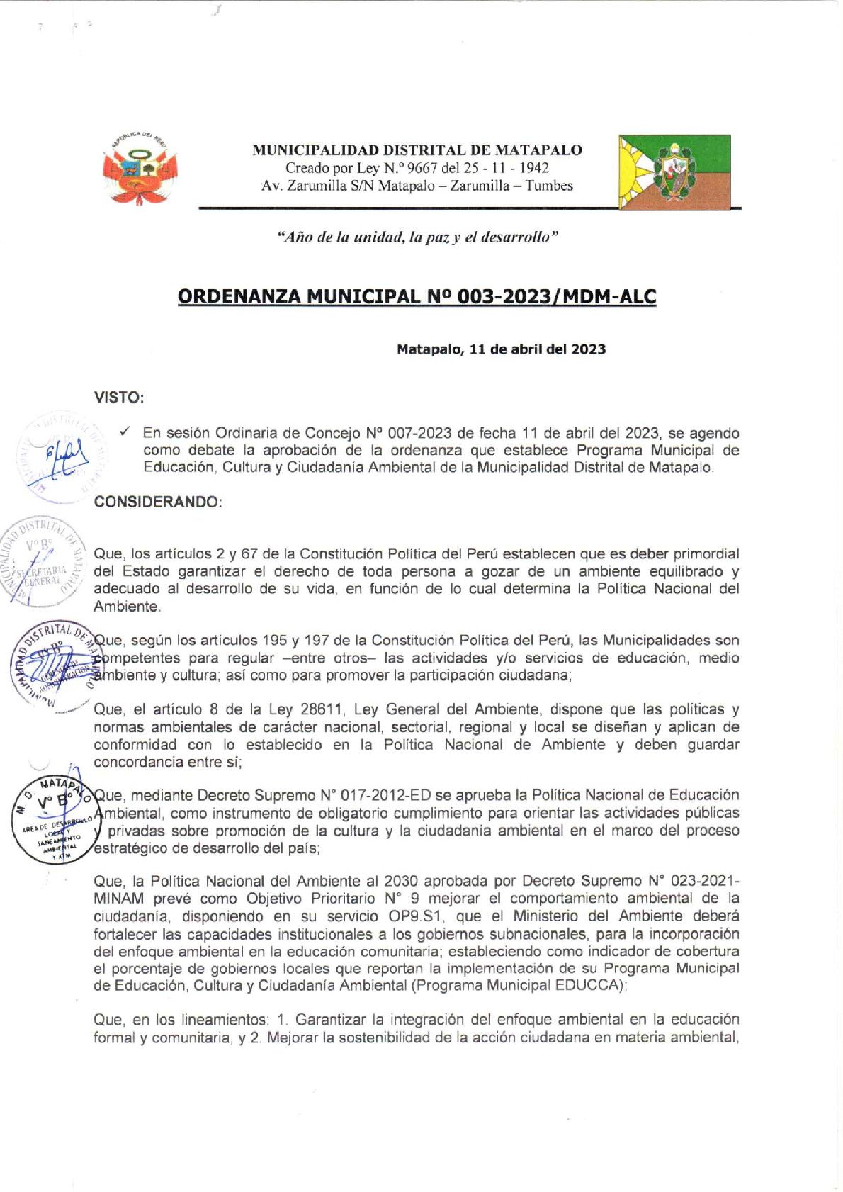 La presente Ordenanza aprueba el Programa Municipal de Educación, Cultura y Ciudadanía Ambiental de la Municipalidad Distrital de Matapalo - Zarumilla (Tumbes), con la finalidad de promover la cultura y la educación ambiental para la formación de ciudadanas y ciudadanos ambientalmente responsables e incentivar la participación ciudadana en todos sus niveles.
