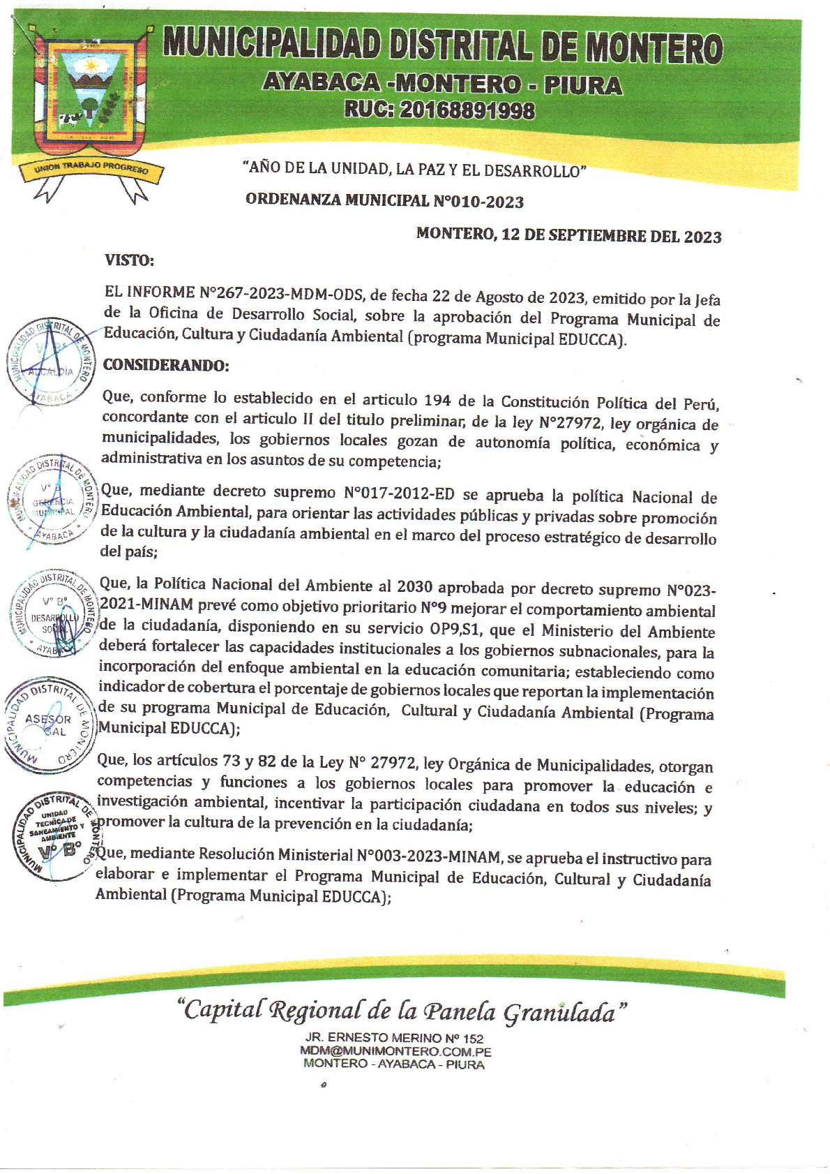 La presente Ordenanza aprueba el Programa Municipal de Educación, Cultura y Ciudadanía Ambiental de la Municipalidad Distrital de Montero - Ayabaca (Piura), con la finalidad de promover la cultura y la educación ambiental para la formación de ciudadanas y ciudadanos ambientalmente responsables e incentivar la participación ciudadana en todos sus niveles.