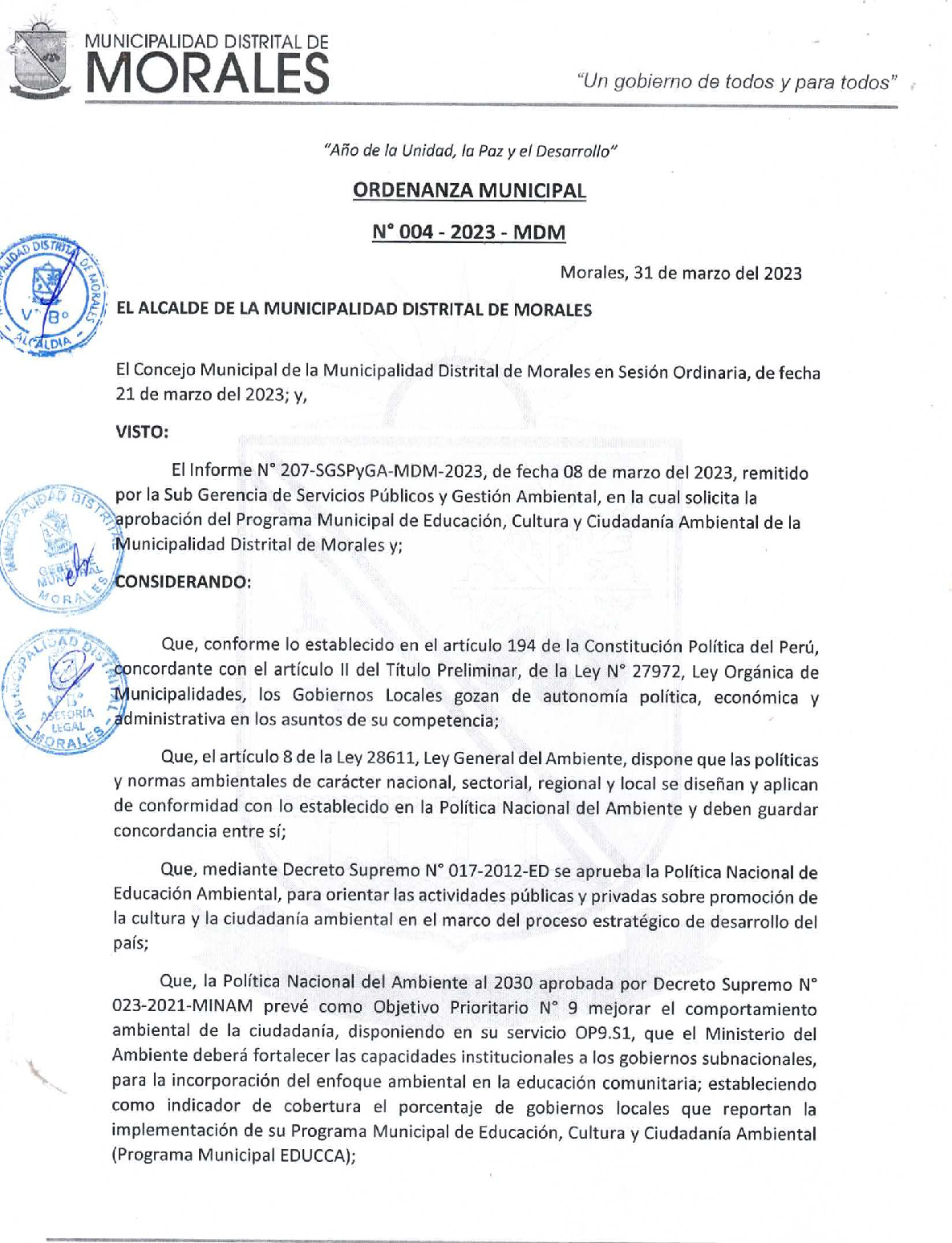 La presente Ordenanza aprueba el Programa Municipal de Educación, Cultura y Ciudadanía Ambiental de la Municipalidad Distrital de Morales - San Martín (San Martín), con la finalidad de promover la cultura y la educación ambiental para la formación de ciudadanas y ciudadanos ambientalmente responsables e incentivar la participación ciudadana en todos sus niveles.
