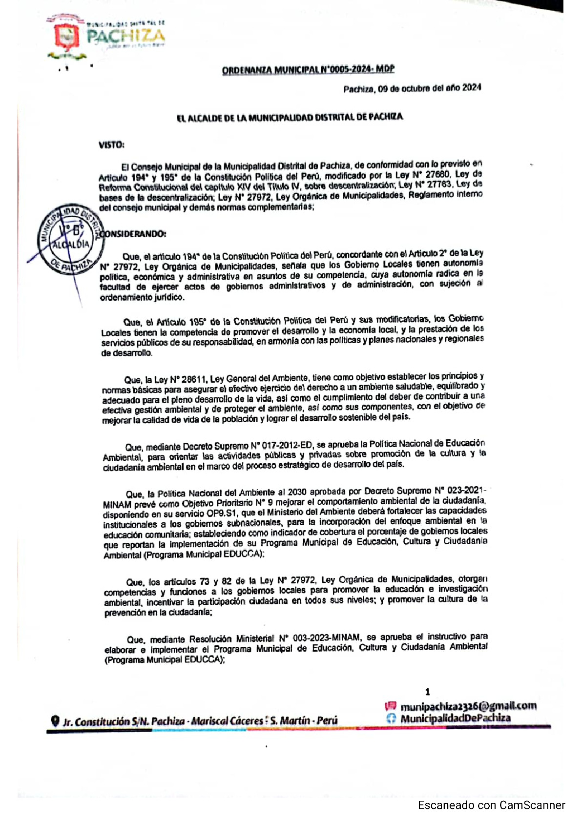 La presente Ordenanza aprueba el Programa Municipal de Educación, Cultura y Ciudadanía Ambiental de la Municipalidad Distrital de Pachiza - Mariscal Cáceres (San Martín), con la finalidad de promover la cultura y la educación ambiental para la formación de ciudadanas y ciudadanos ambientalmente responsables e incentivar la participación ciudadana en todos sus niveles.