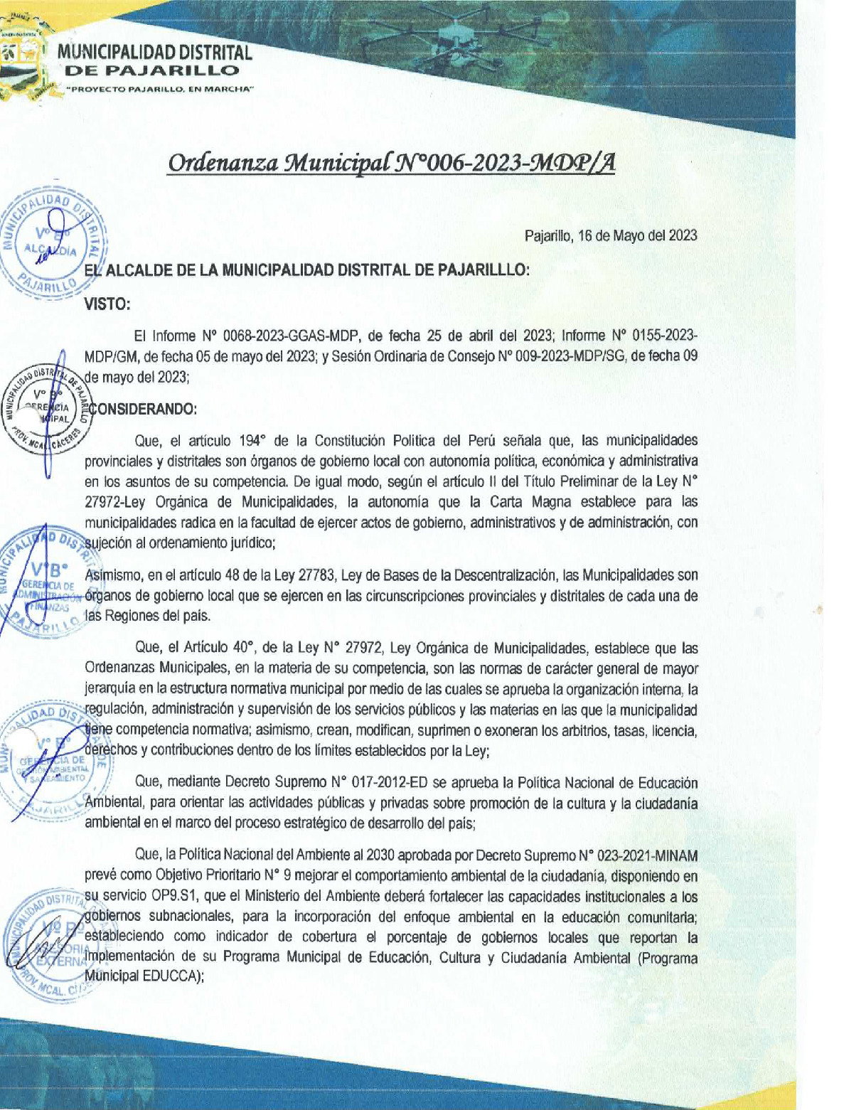 La presente Ordenanza aprueba el Programa Municipal de Educación, Cultura y Ciudadanía Ambiental de la Municipalidad Distrital de Pajarillo - Mariscal Cáceres (San Martín), con la finalidad de promover la cultura y la educación ambiental para la formación de ciudadanas y ciudadanos ambientalmente responsables e incentivar la participación ciudadana en todos sus niveles.
