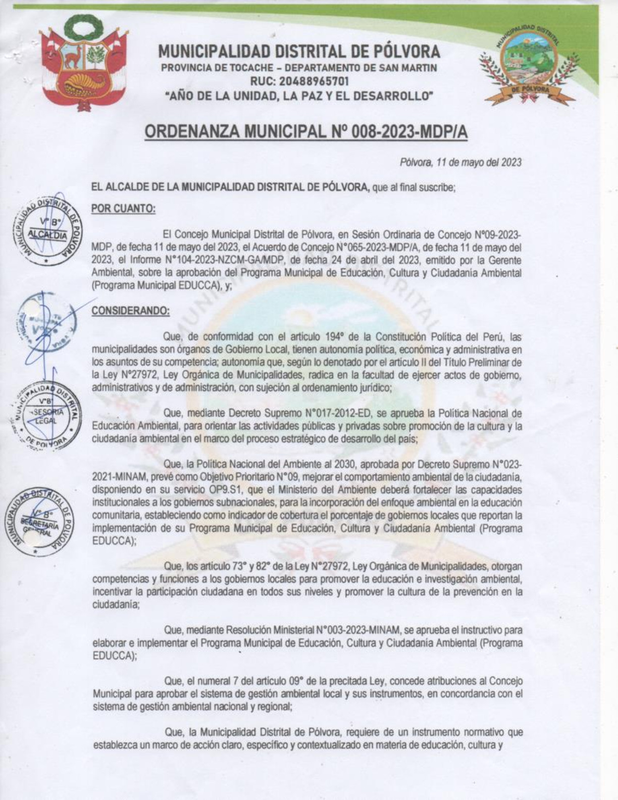 La presente Ordenanza aprueba el Programa Municipal de Educación, Cultura y Ciudadanía Ambiental de la Municipalidad Distrital de Pólvora - Tocache (San Martín), con la finalidad de promover la cultura y la educación ambiental para la formación de ciudadanas y ciudadanos ambientalmente responsables e incentivar la participación ciudadana en todos sus niveles.