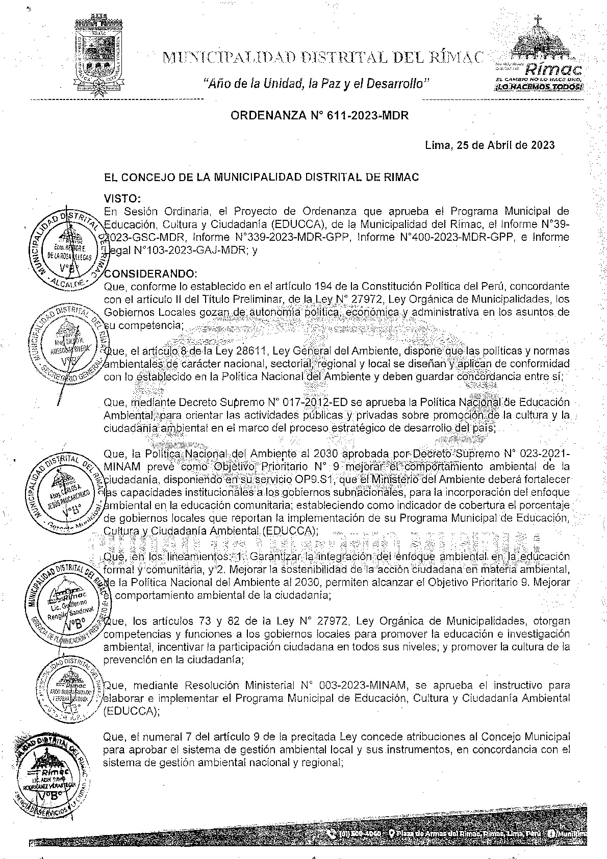 La presente Ordenanza aprueba el Programa Municipal de Educación, Cultura y Ciudadanía Ambiental de la Municipalidad Distrital de Rímac - Lima (Lima Metropolitana), con la finalidad de promover la cultura y la educación ambiental para la formación de ciudadanas y ciudadanos ambientalmente responsables e incentivar la participación ciudadana en todos sus niveles.
