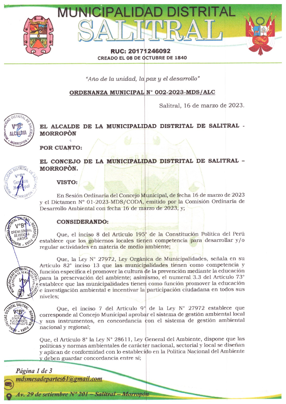 La presente Ordenanza aprueba el Programa Municipal de Educación, Cultura y Ciudadanía Ambiental de la Municipalidad Distrital de Salitral - Morropón (Piura), con la finalidad de promover la cultura y la educación ambiental para la formación de ciudadanas y ciudadanos ambientalmente responsables e incentivar la participación ciudadana en todos sus niveles.