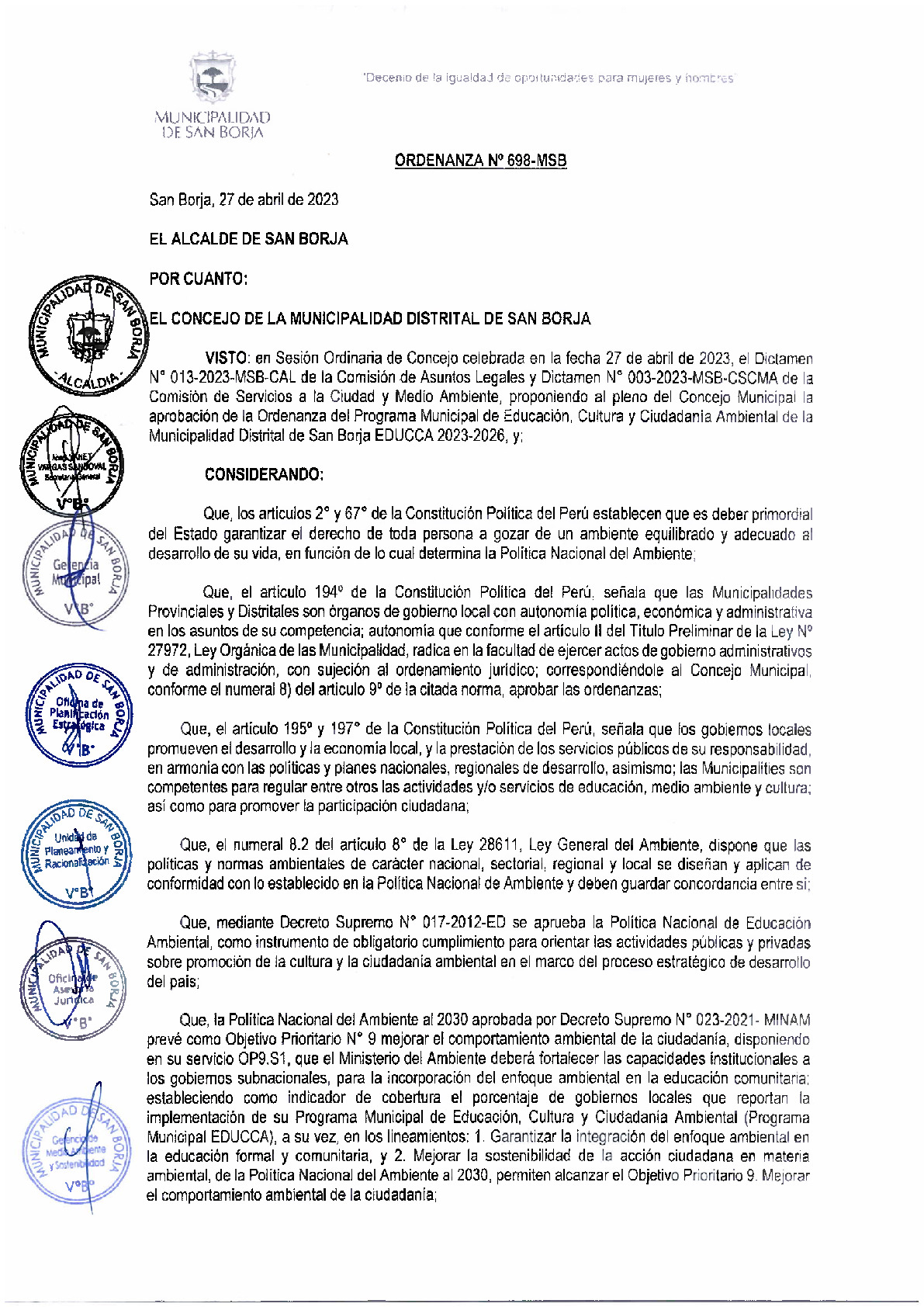 La presente Ordenanza aprueba el Programa Municipal de Educación, Cultura y Ciudadanía Ambiental de la Municipalidad Distrital de San Borja - Lima (Lima Metropolitana), con la finalidad de promover la cultura y la educación ambiental para la formación de ciudadanas y ciudadanos ambientalmente responsables e incentivar la participación ciudadana en todos sus niveles.