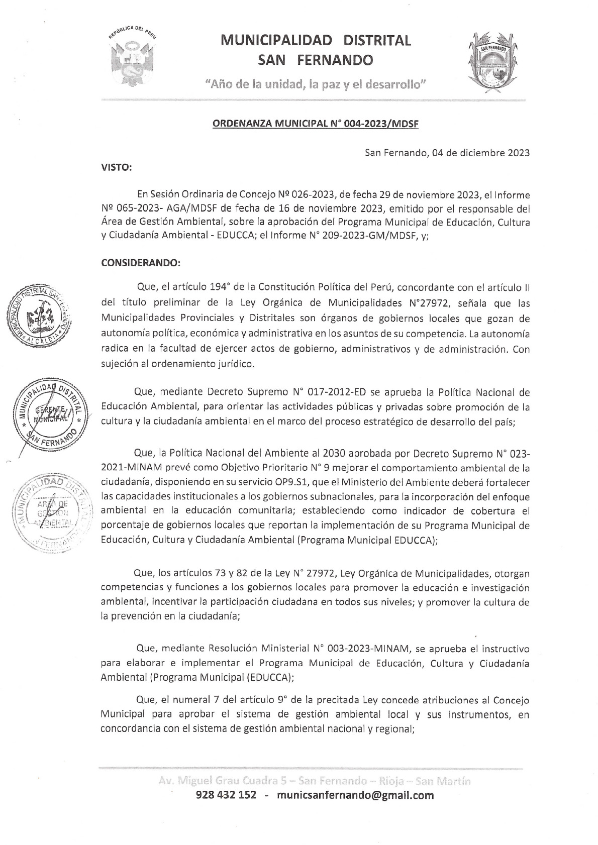 La presente Ordenanza aprueba el Programa Municipal de Educación, Cultura y Ciudadanía Ambiental de la Municipalidad Distrital de San Fernando - Rioja (San Martín), con la finalidad de promover la cultura y la educación ambiental para la formación de ciudadanas y ciudadanos ambientalmente responsables e incentivar la participación ciudadana en todos sus niveles.