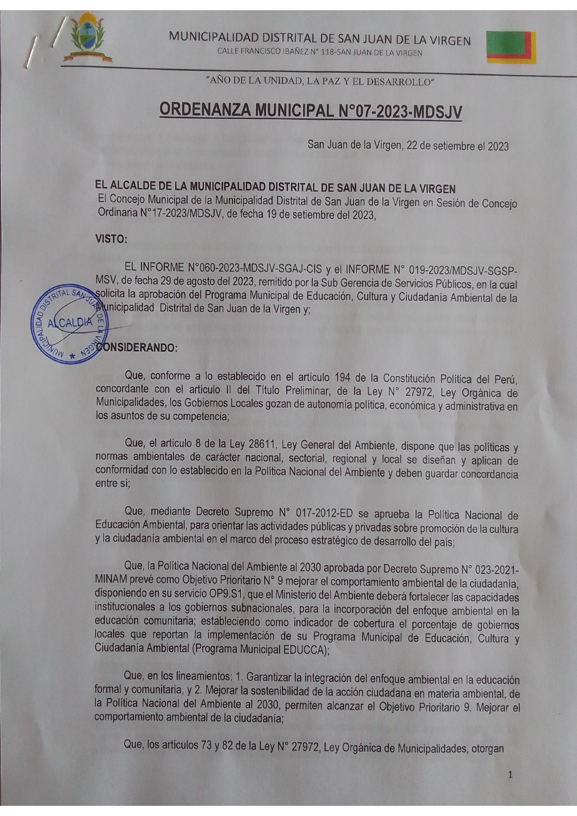 Programa Municipal de Educación, Cultura y Ciudadanía Ambiental de la Municipalidad Distrital de San Juan de la Virgen