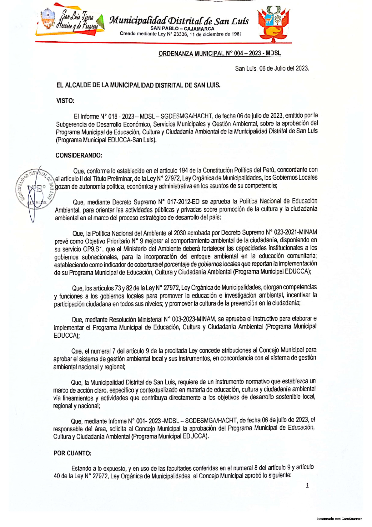 La presente Ordenanza aprueba el Programa Municipal de Educación, Cultura y Ciudadanía Ambiental de la Municipalidad Distrital de San Luis - San Pablo (Cajamarca), con la finalidad de promover la cultura y la educación ambiental para la formación de ciudadanas y ciudadanos ambientalmente responsables e incentivar la participación ciudadana en todos sus niveles.