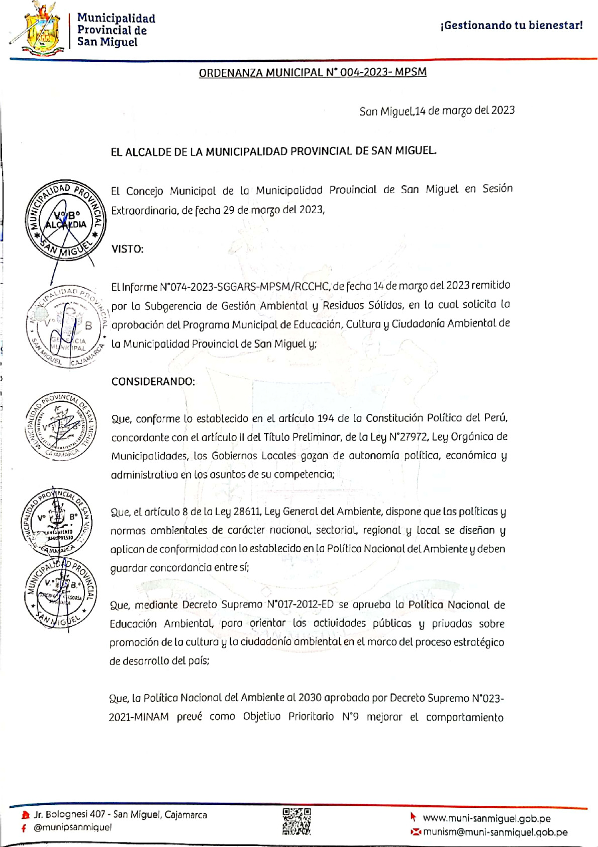 La presente Ordenanza aprueba el Programa Municipal de Educación, Cultura y Ciudadanía Ambiental de la Municipalidad Provincial de San Miguel - San Miguel (Cajamarca), con la finalidad de promover la cultura y la educación ambiental para la formación de ciudadanas y ciudadanos ambientalmente responsables e incentivar la participación ciudadana en todos sus niveles.
